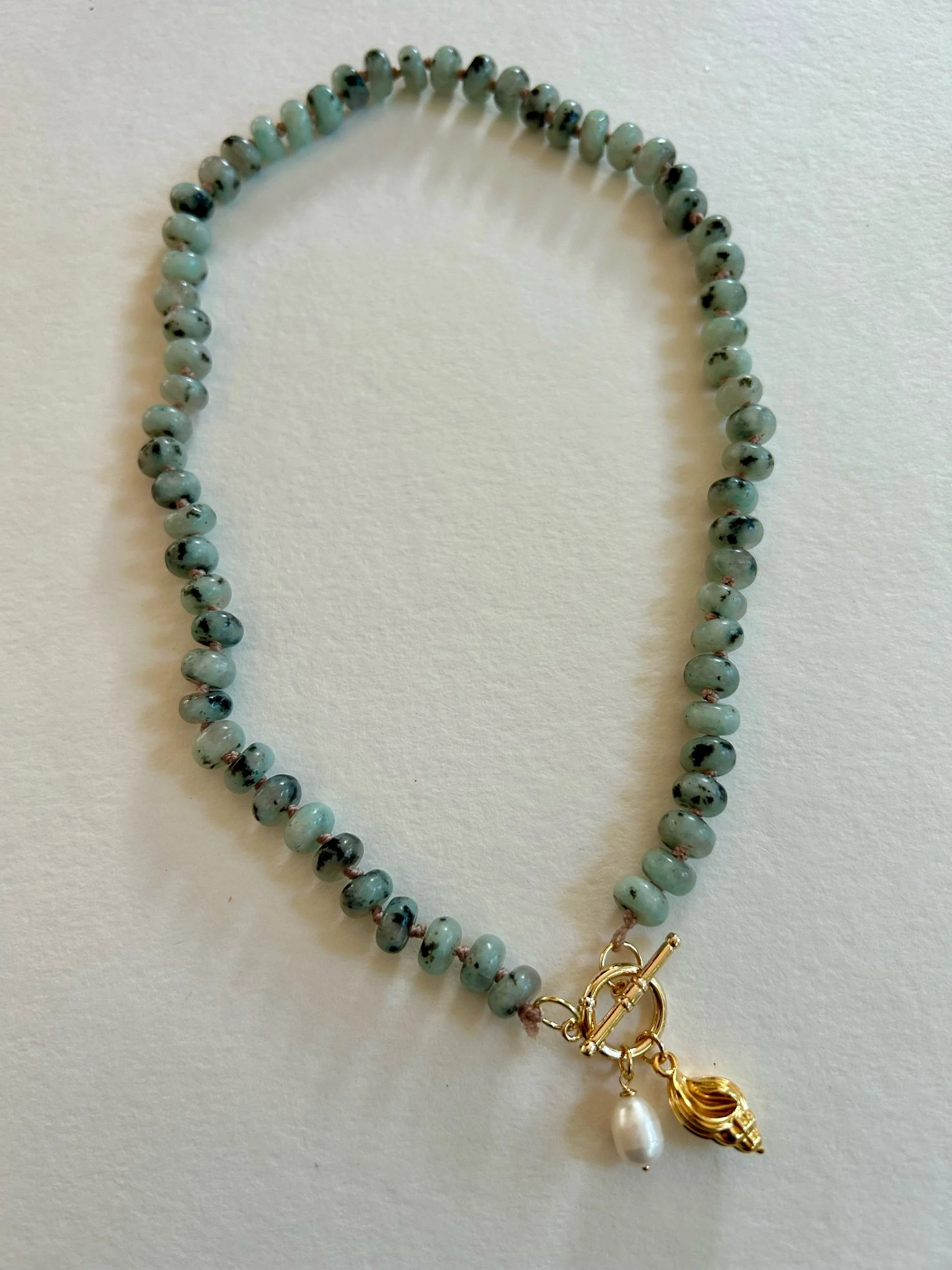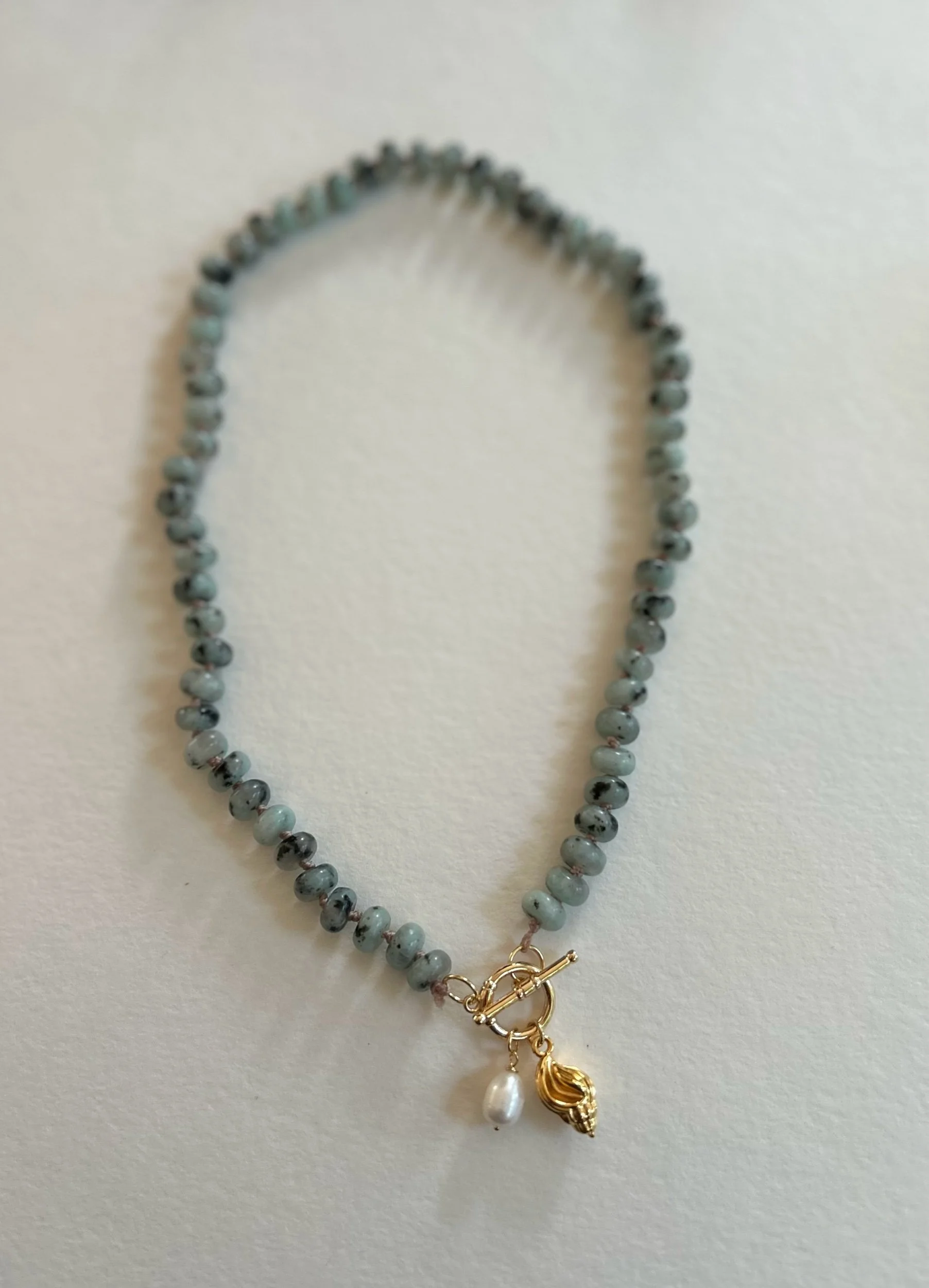 This perfectly coastal necklace will have you dreaming of beach days all year long! It is approximately 18” and features aquamarine beads and a fresh water coin pearl. It has a lobster clasp closure and 2” chain extender.