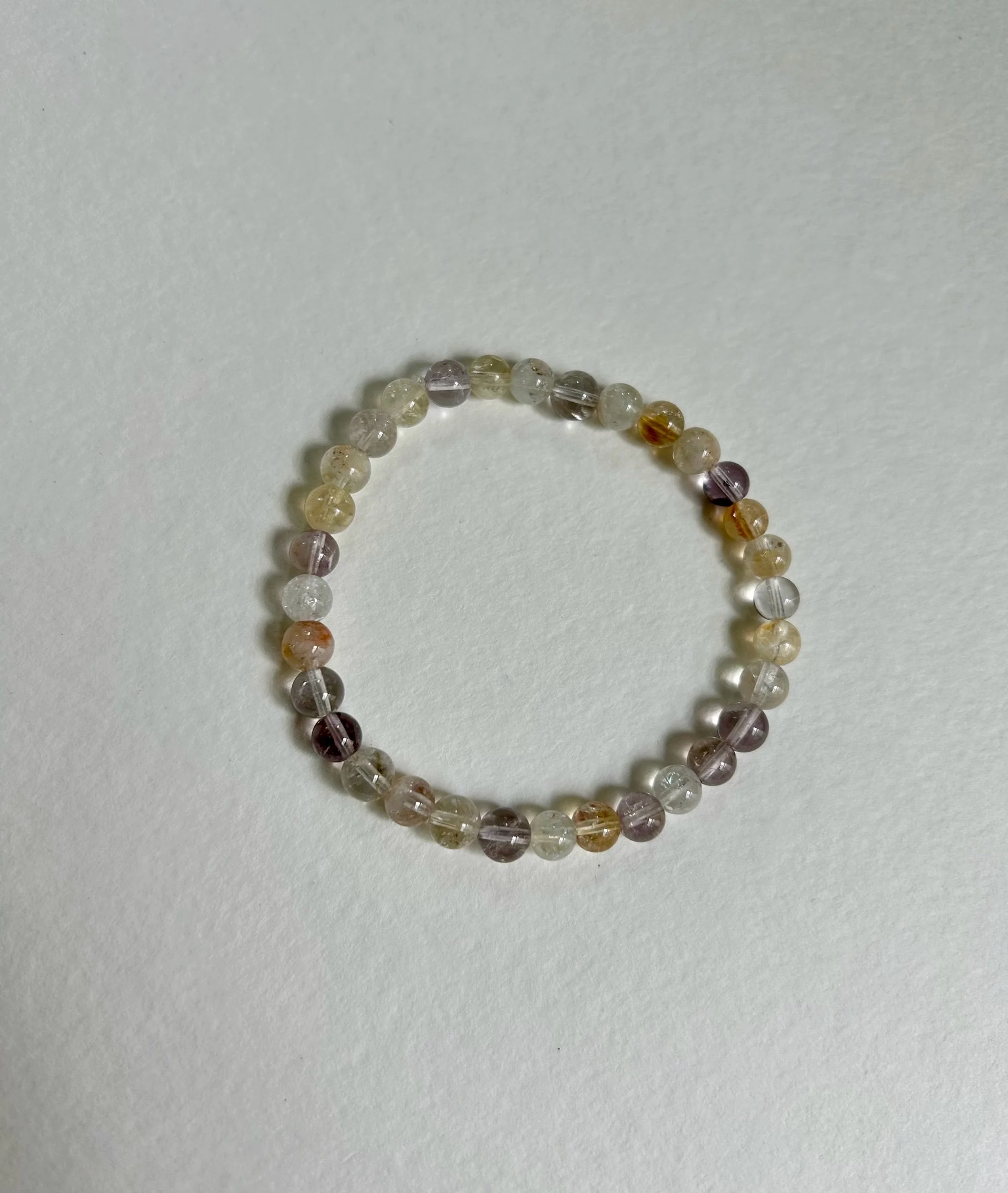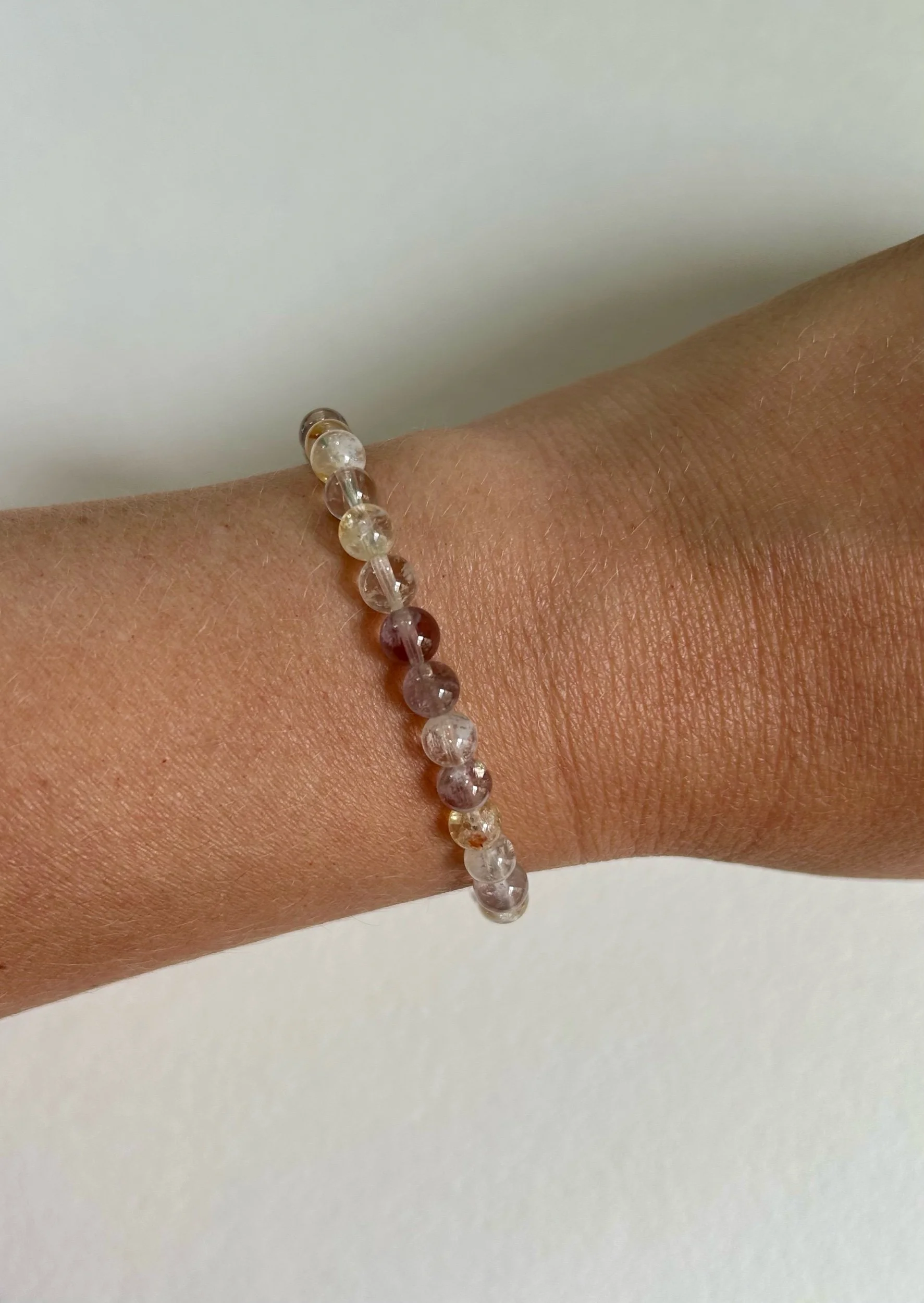 The is bracelet features beautiful 6mm iolite beads that have purple and gray hues. It has a lavender amethyst focal bead with rose gold accents. It is approximately 7” and made on clear and durable stretch cord.