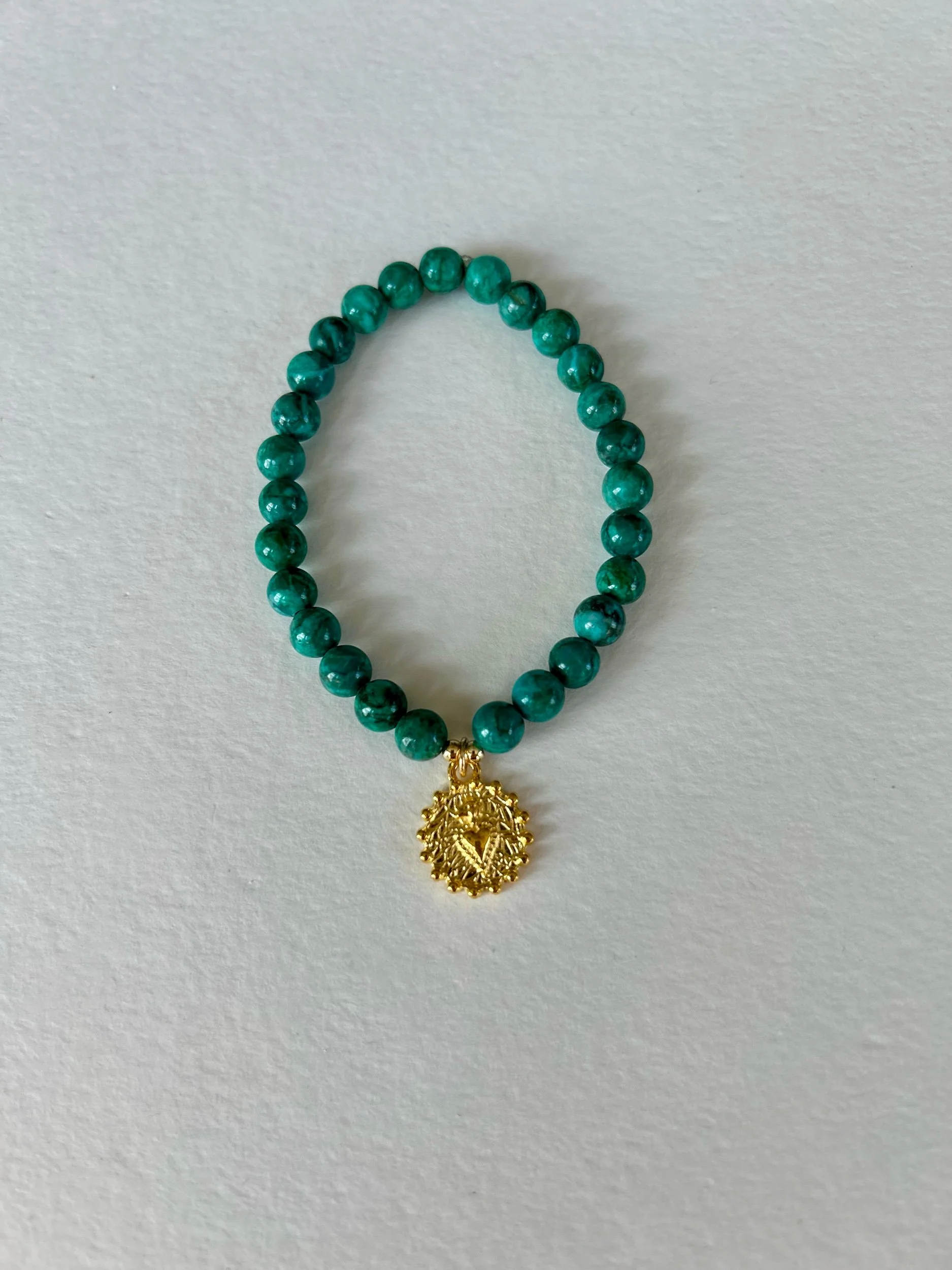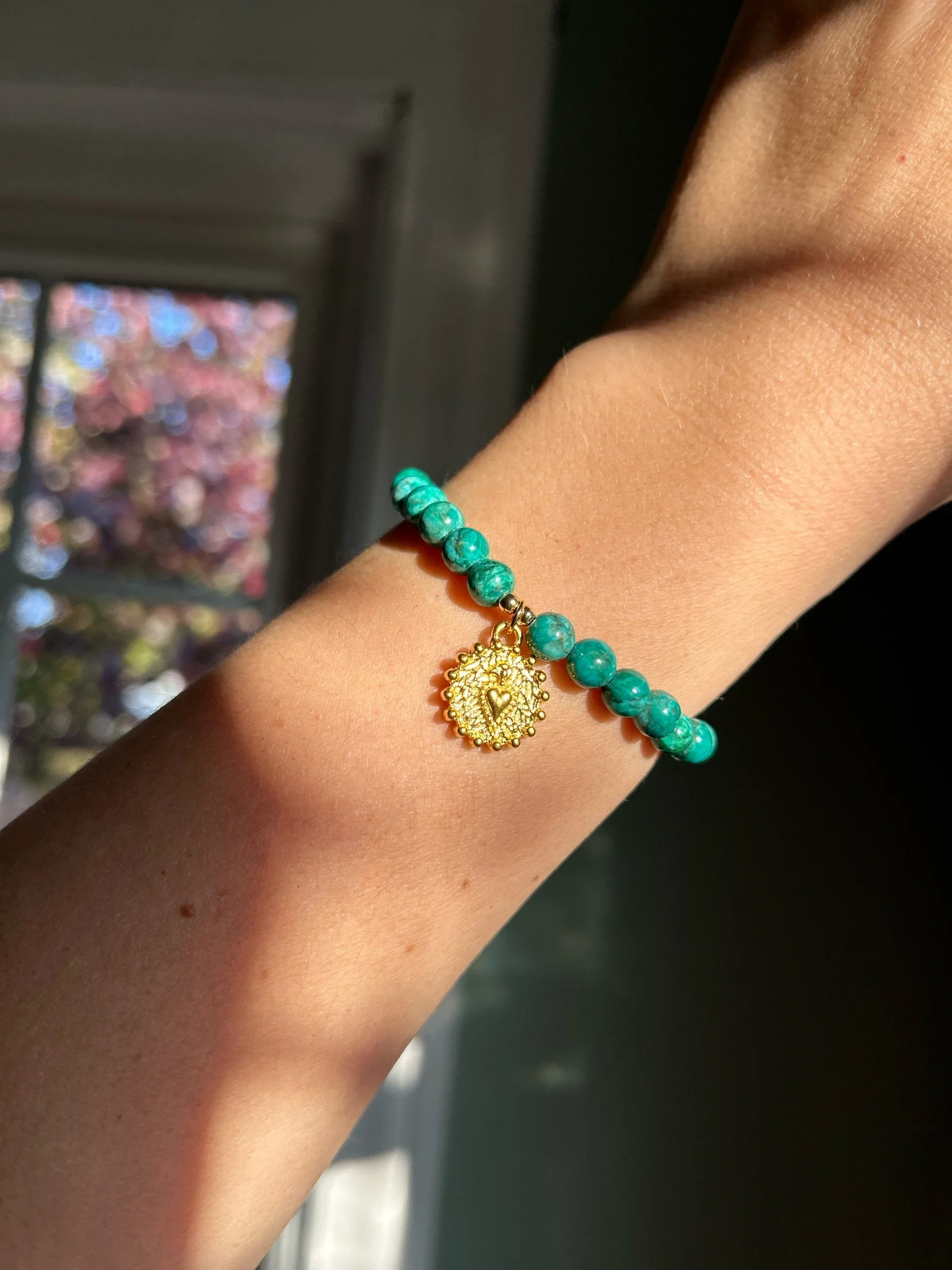 These vibrant 6mm teal peacock jasper beads are a fun pop of color! And the yellow gold heart coin charm is the perfect accent. Each bracelet is 7” and made on clear and durable stretch cord.