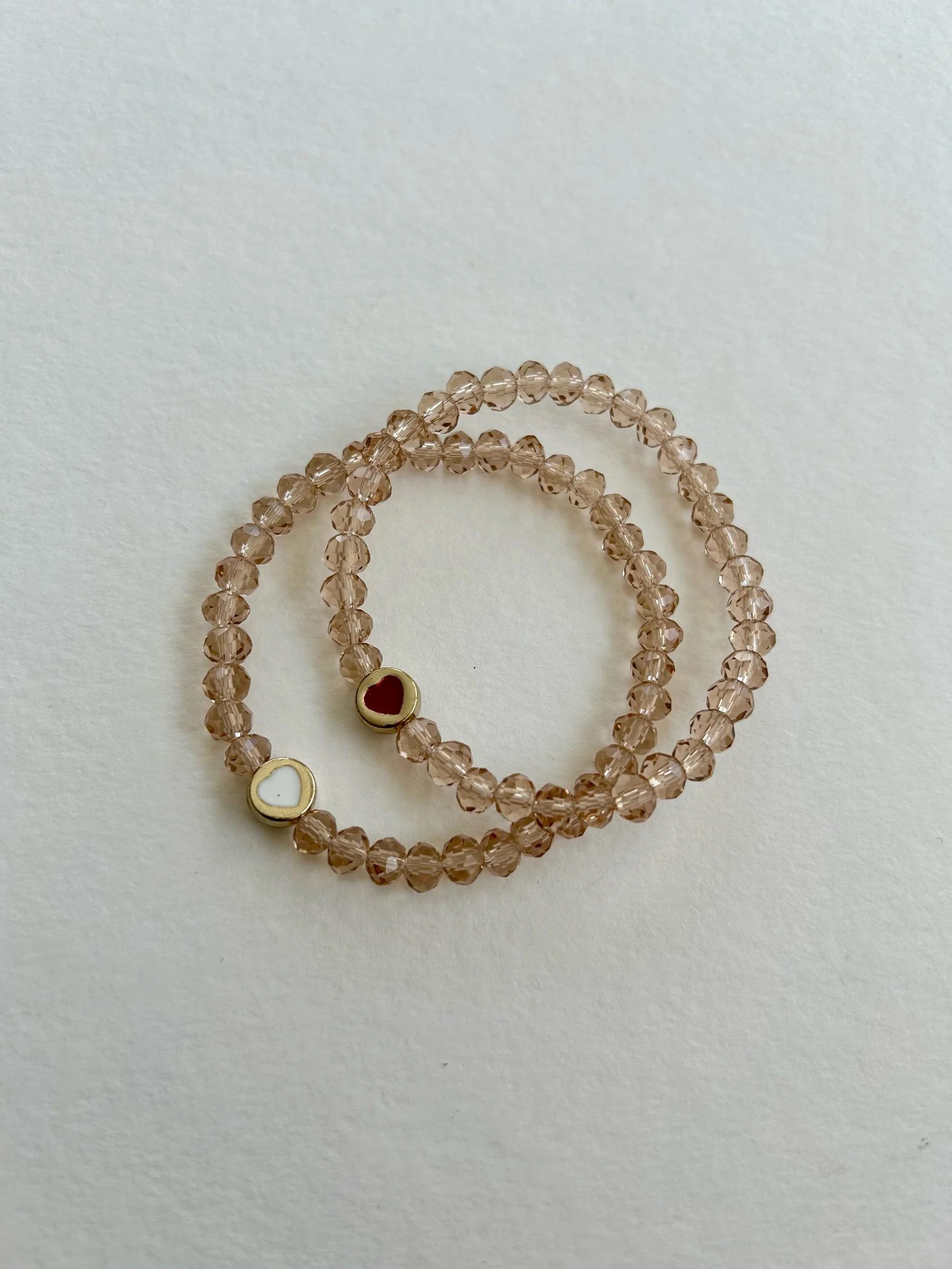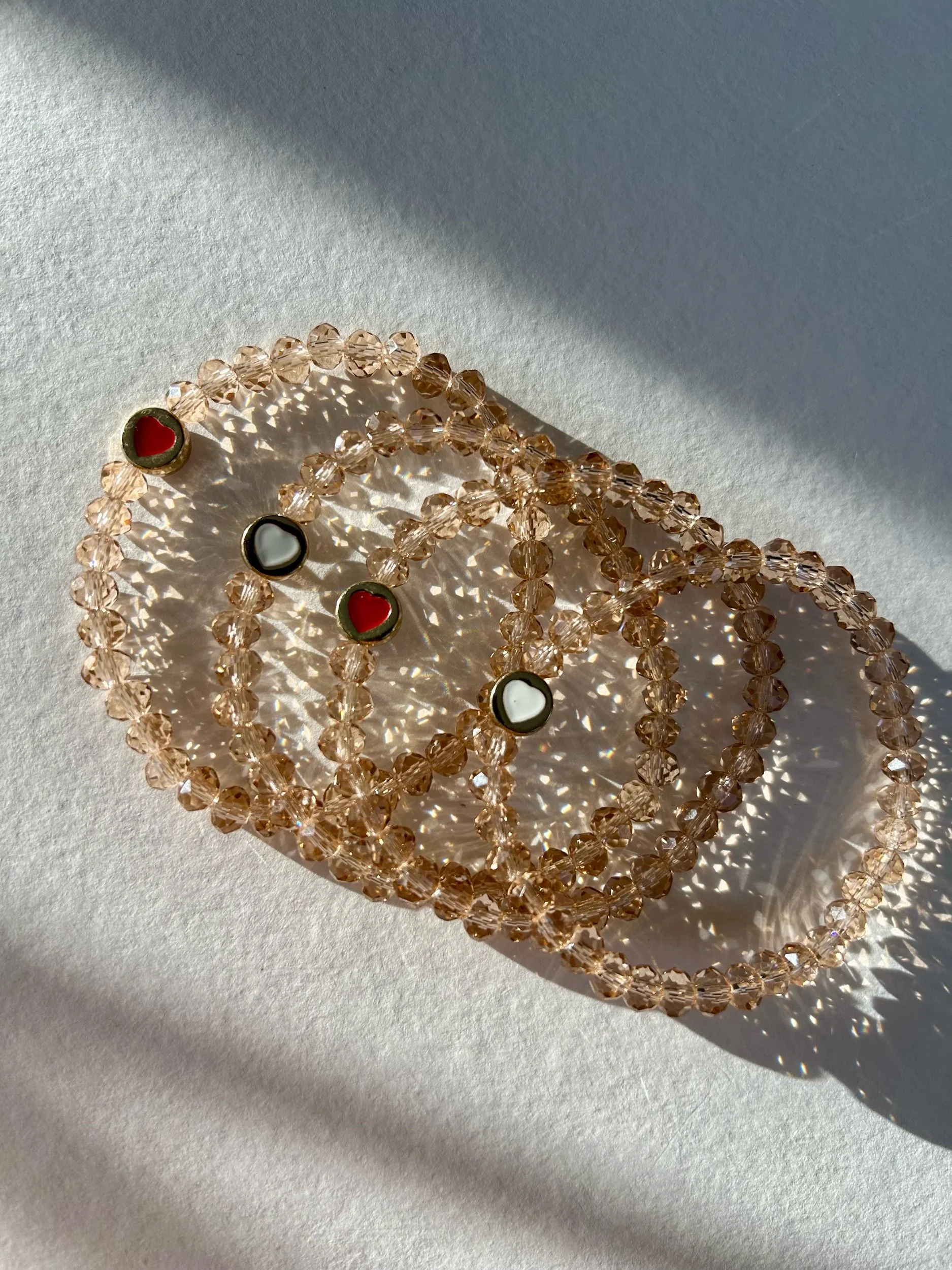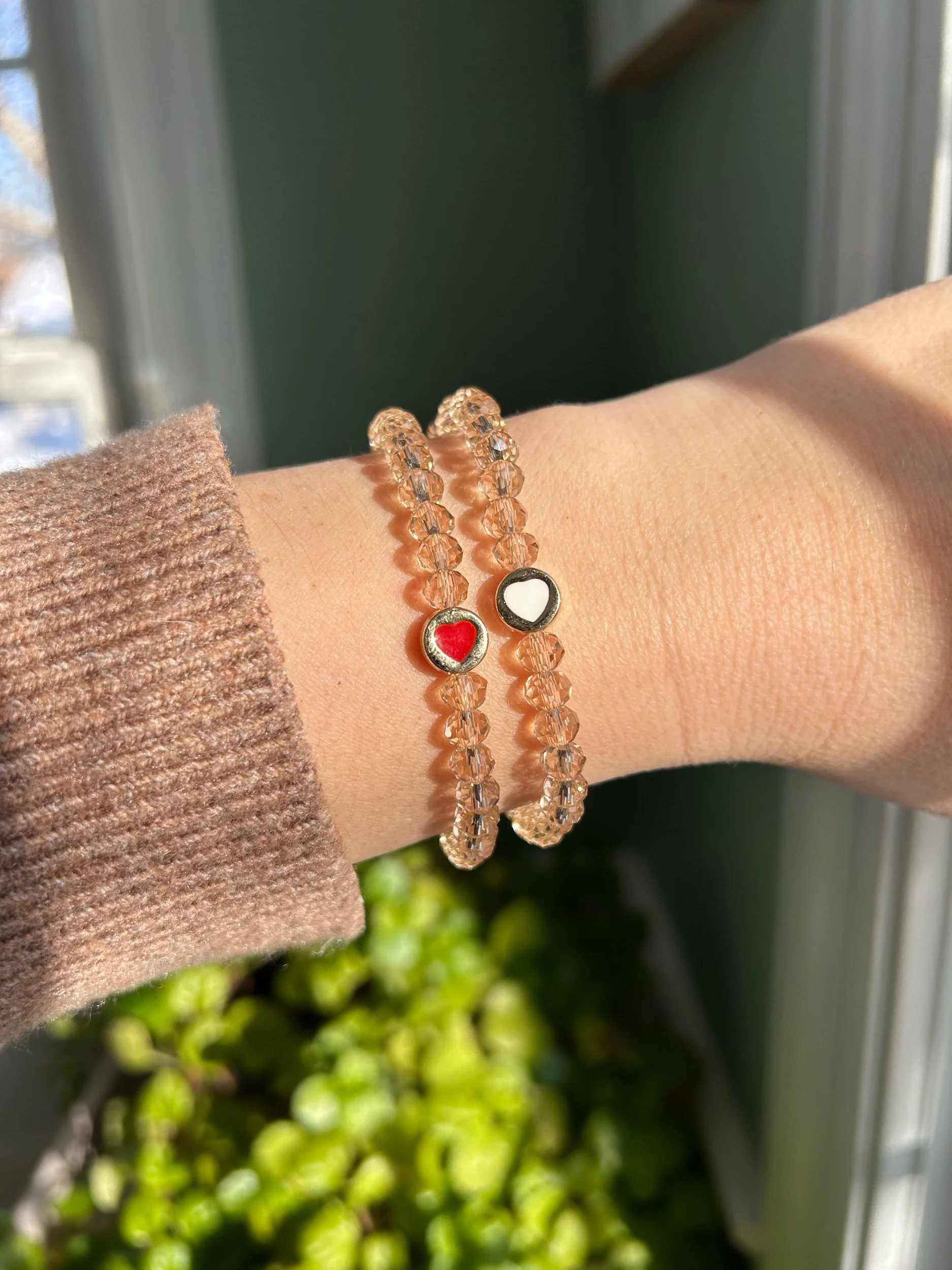 This bracelet is made with sparkly faceted champagne crystal glass and features your choice of a white or red heart accent. Each is approximately 7” and made on clear and durable stretch cord.
