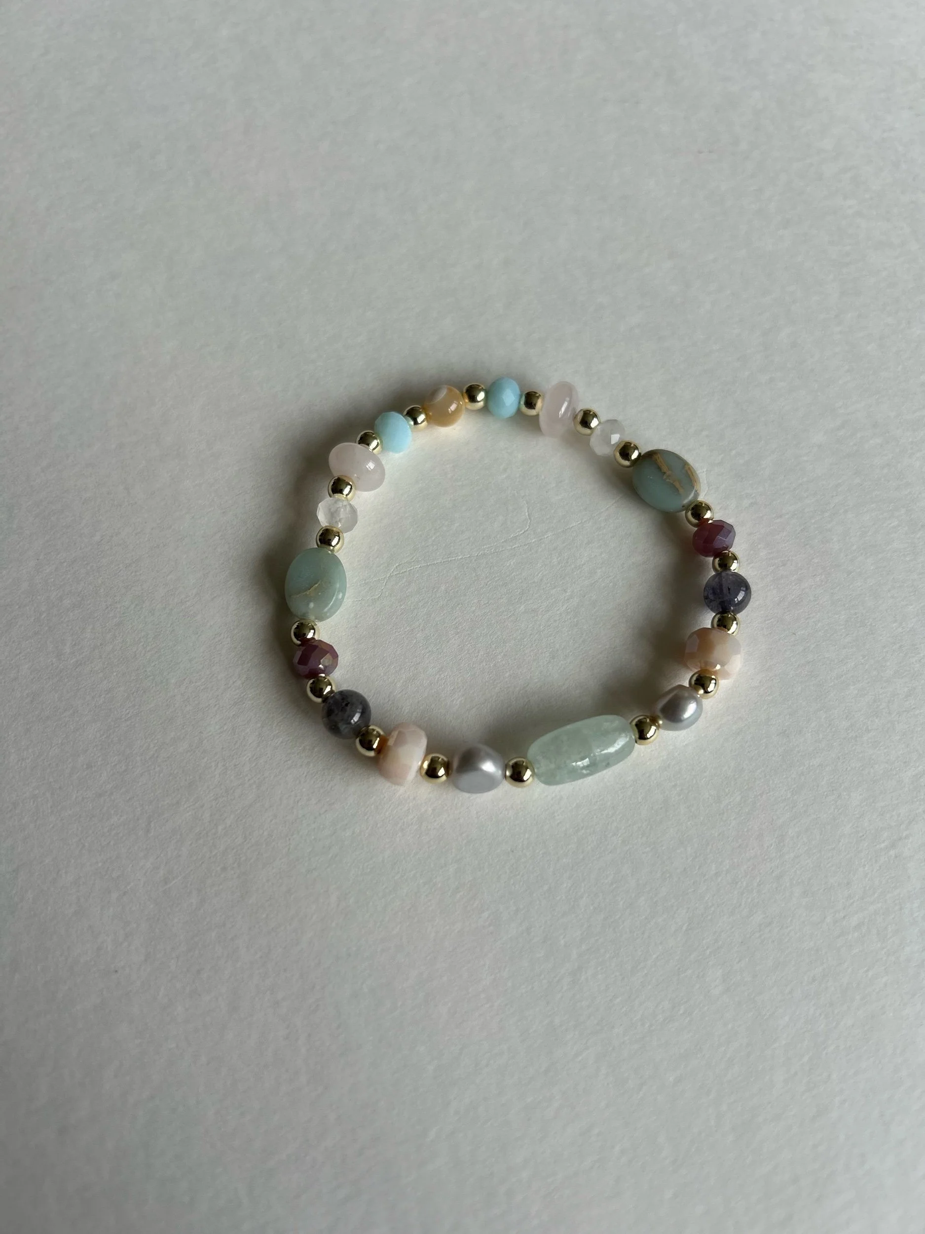 This one of a kind bracelet has a beautiful mix of gemstones, glass, and gold filled accents! It is approximately 7” and made on clear and durable stretch cord.
