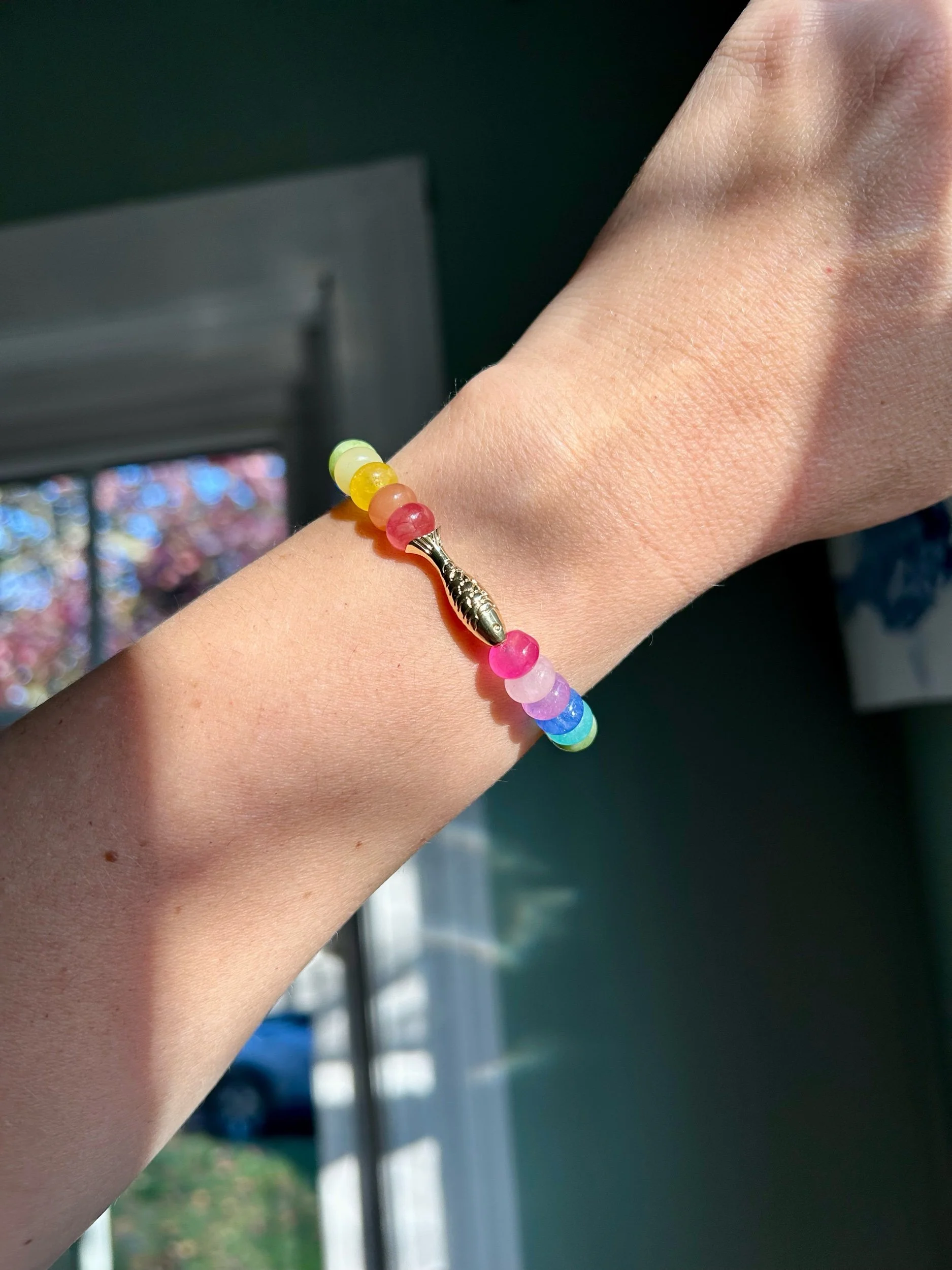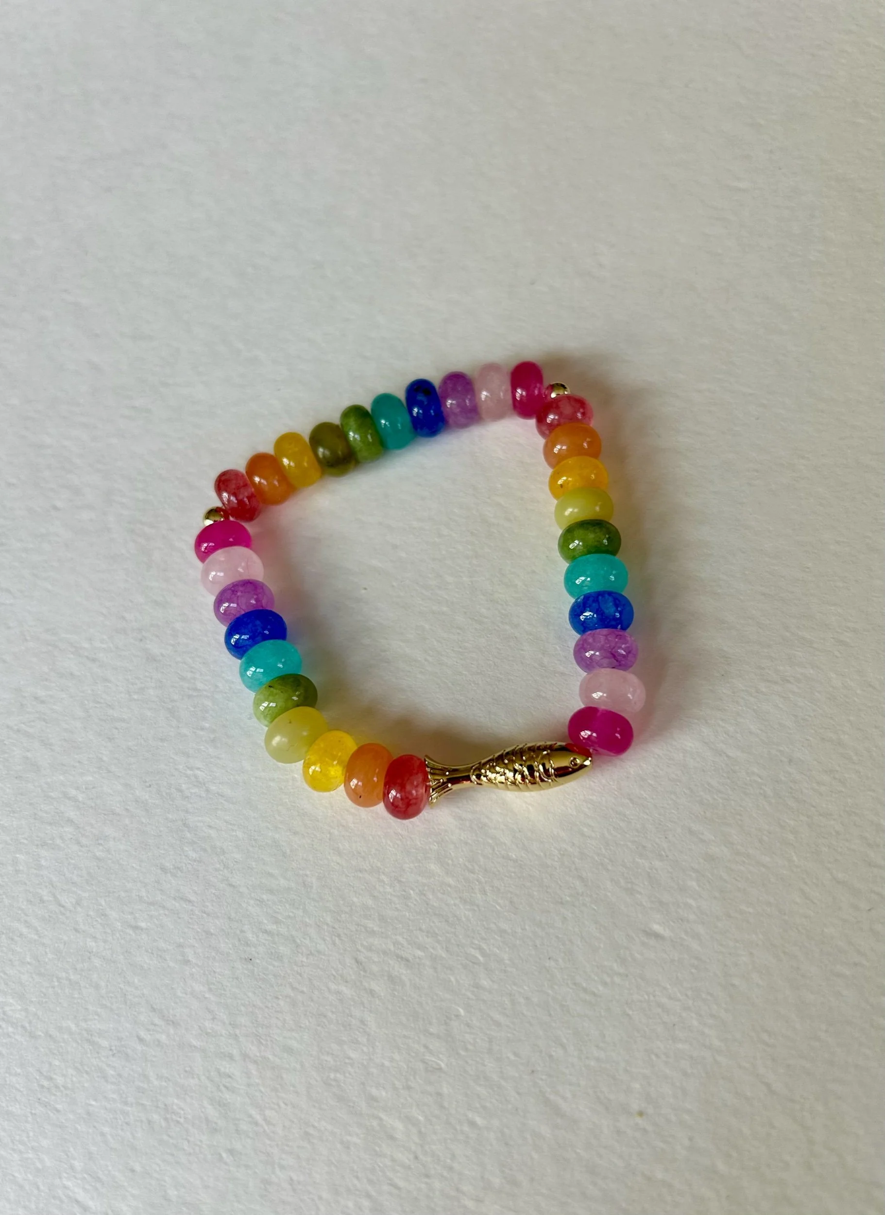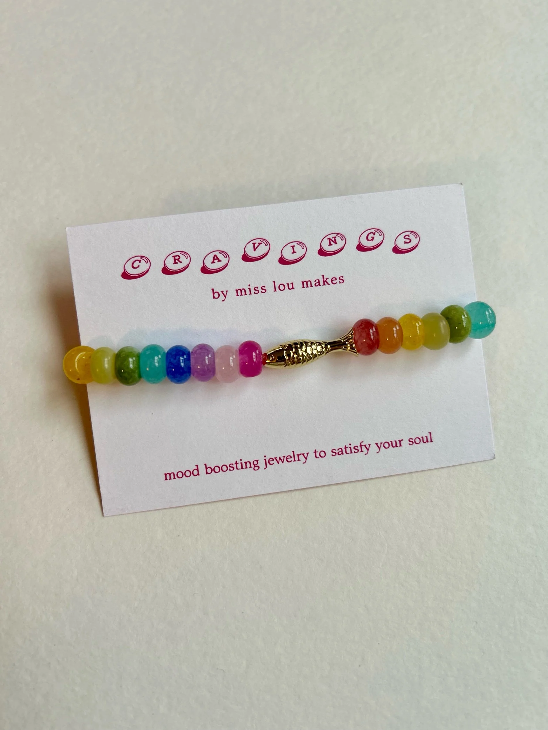 This colorful bracelet is made with jade rondelle beads and has gold filled ball accents. It has a gold filled fish centerpiece. It’s approximately 7” and made on clear and durable stretch cord. It comes packaged on a Cravings Collection card.