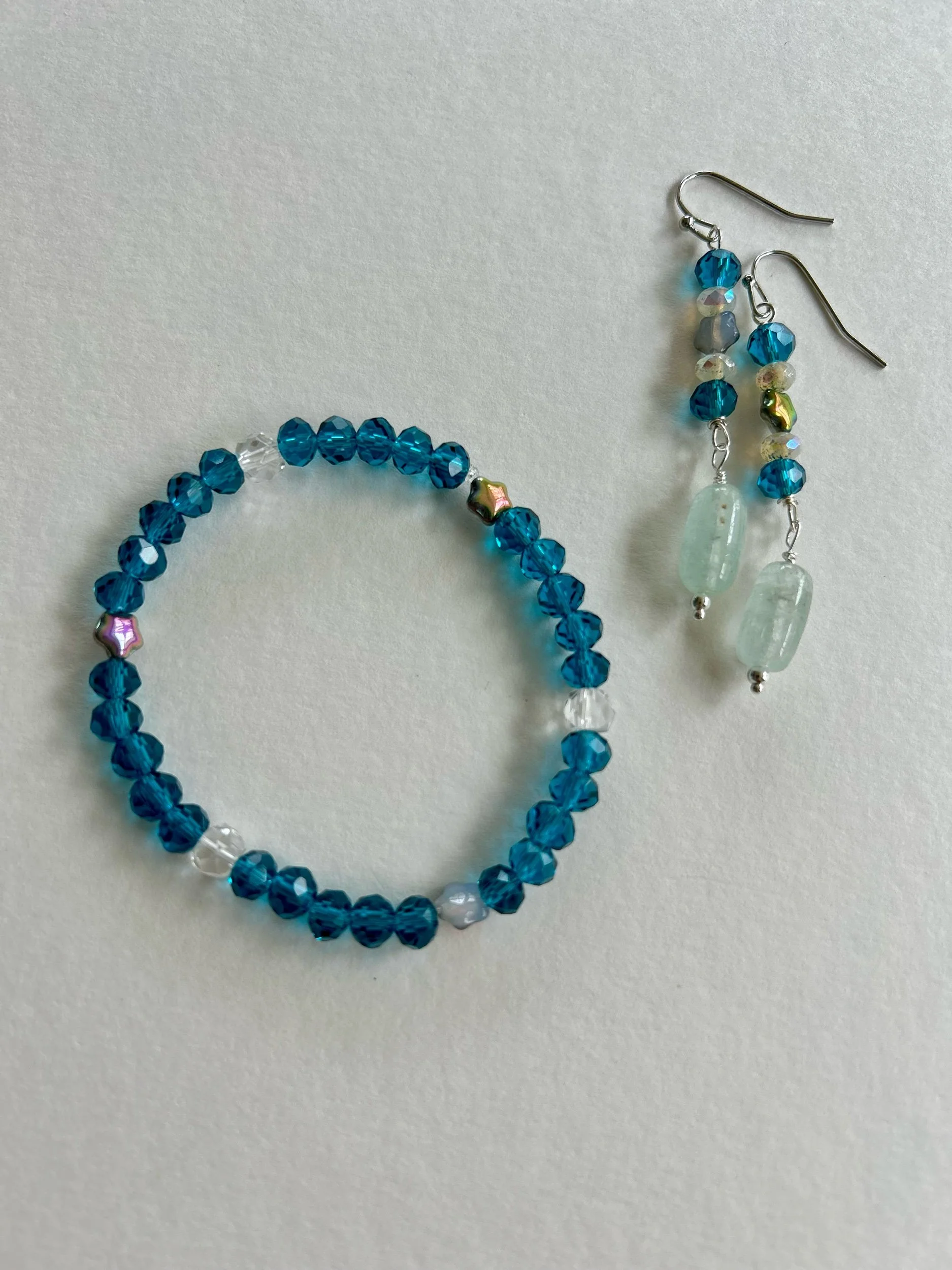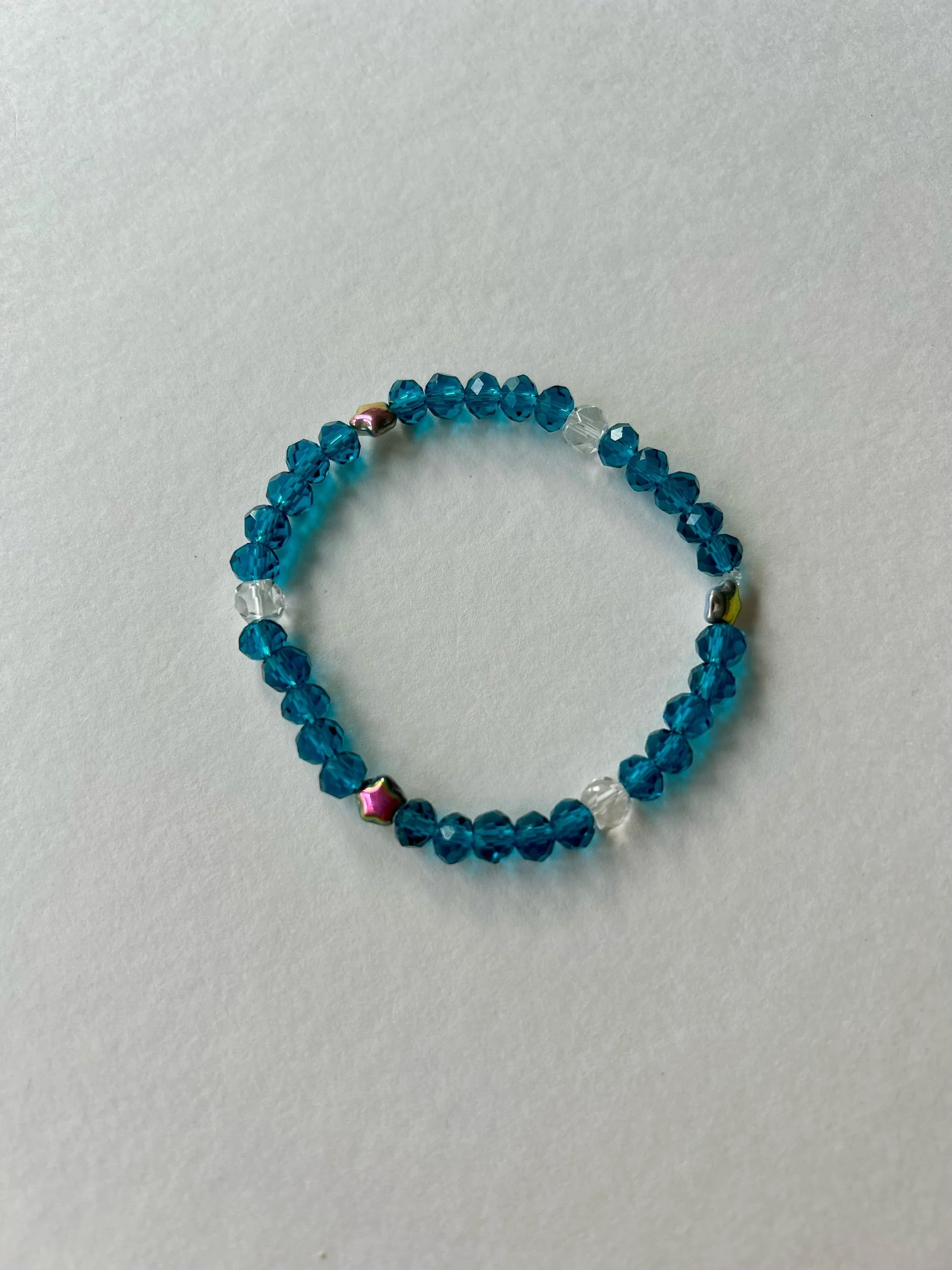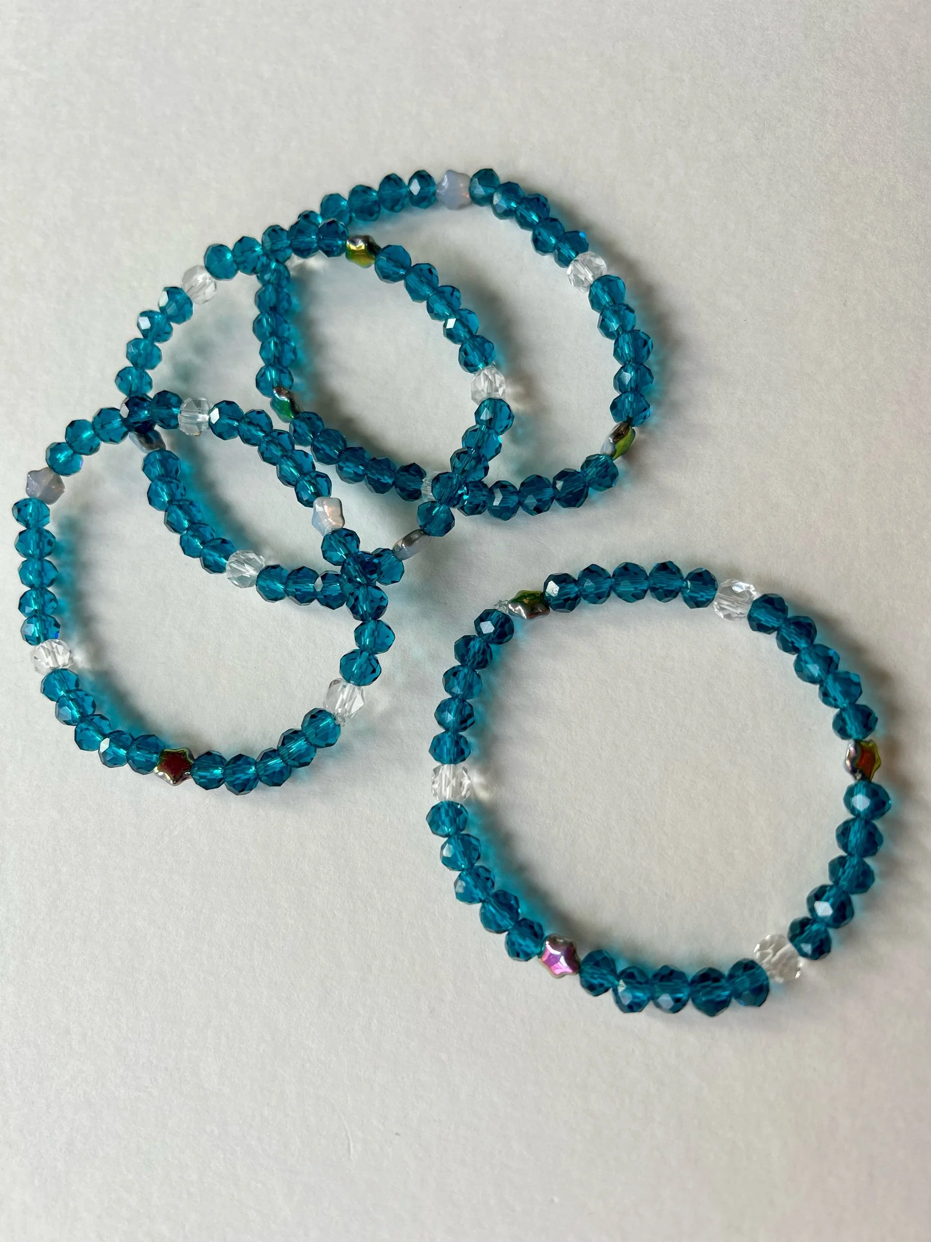 This bracelet features faceted deep blue crystal, clear quartz, and small opalite stars that are white on one side and metallic on the other. It is made on clear and durable stretch cord and is approximately 7”.