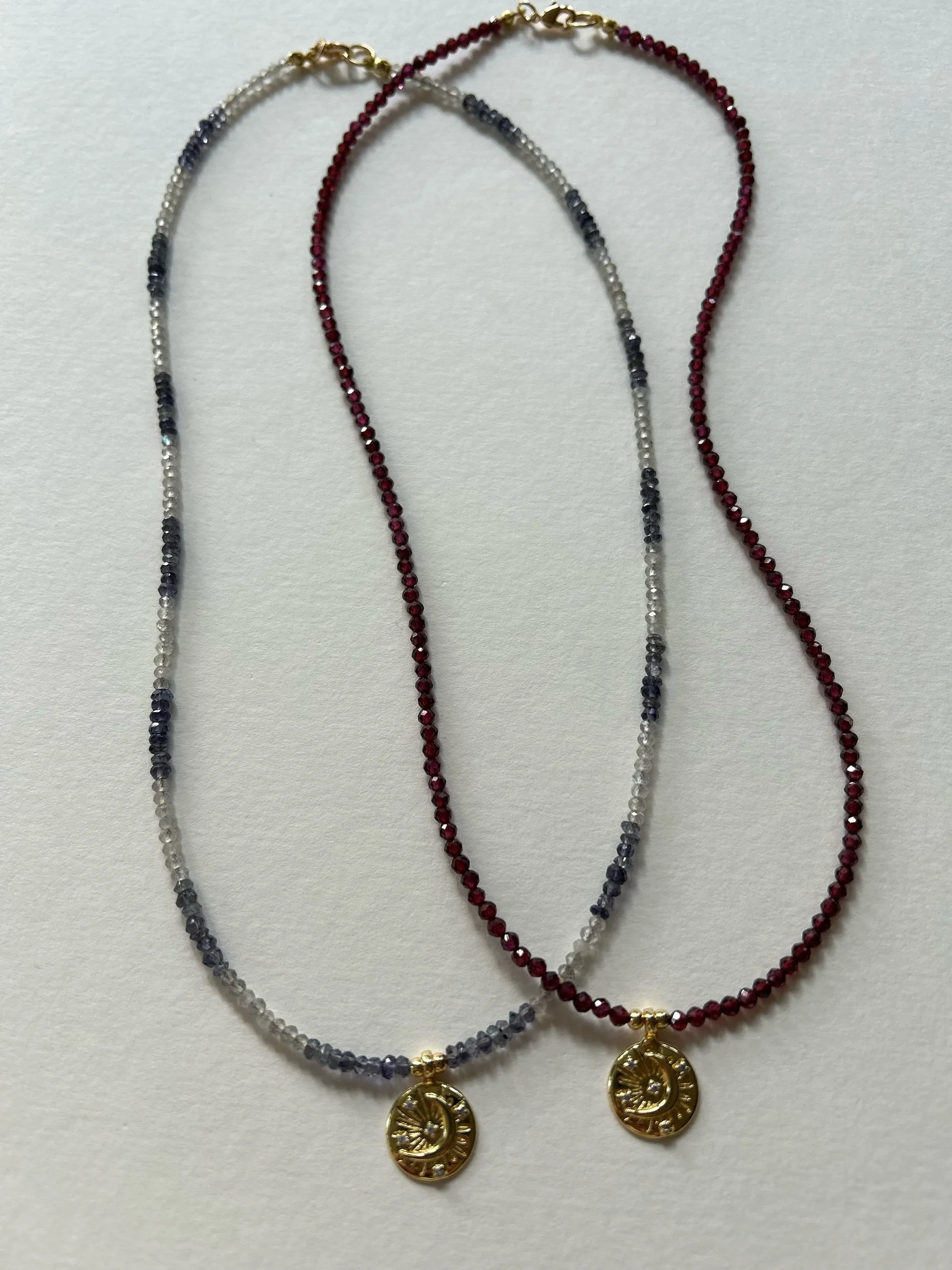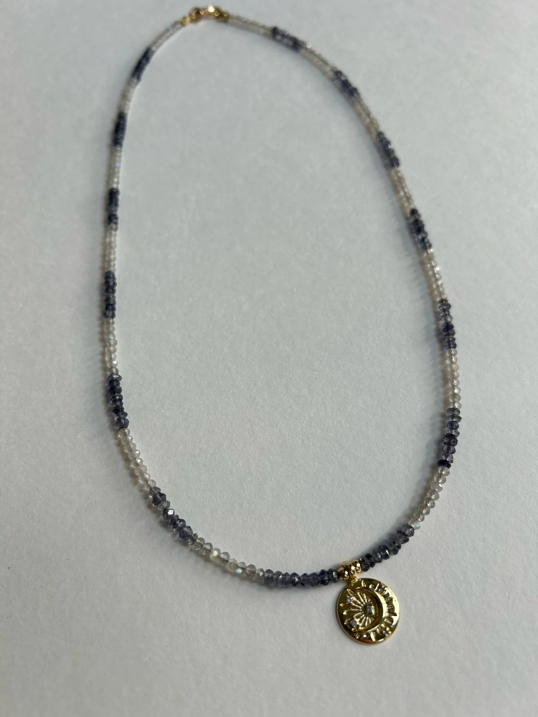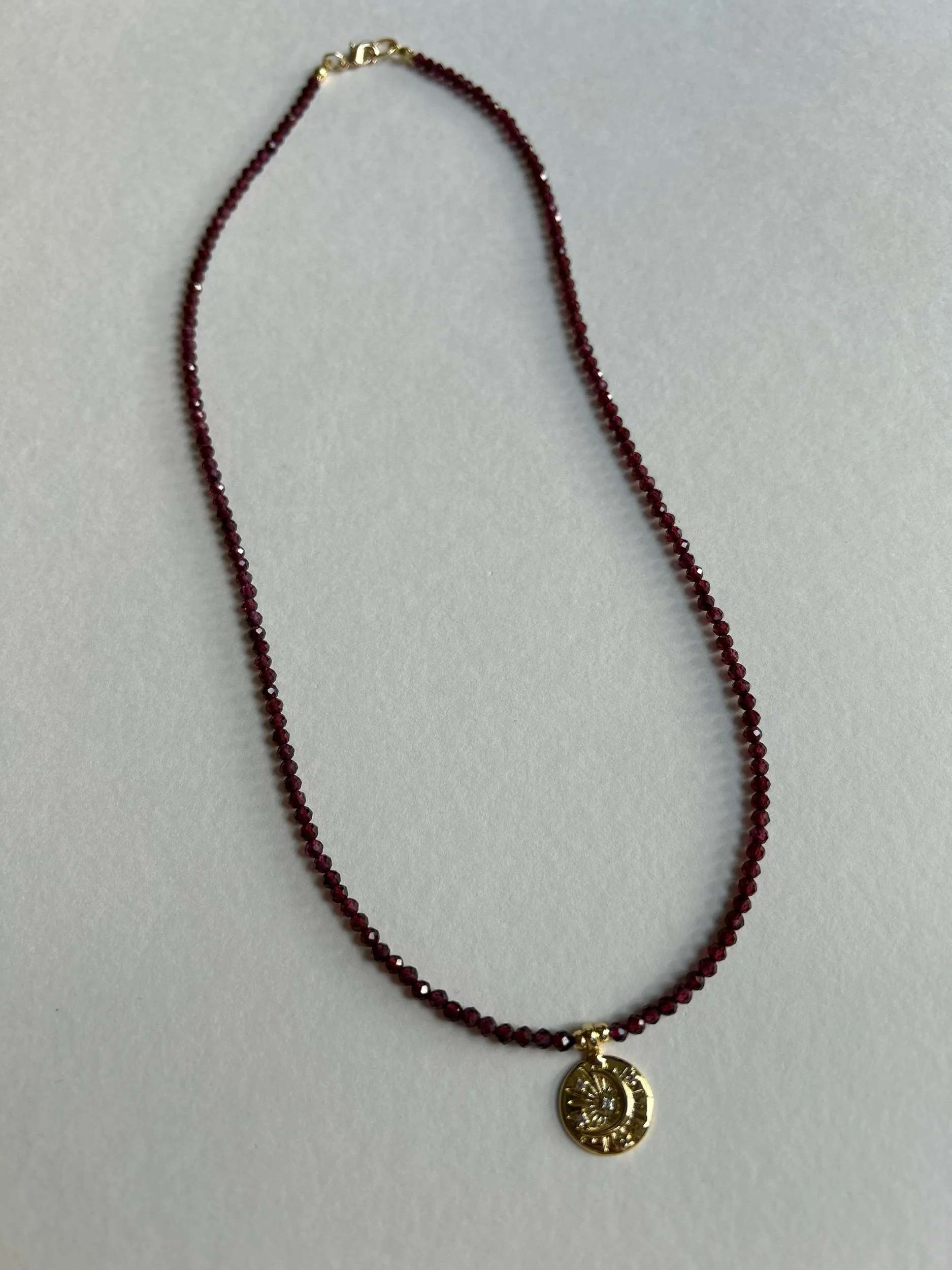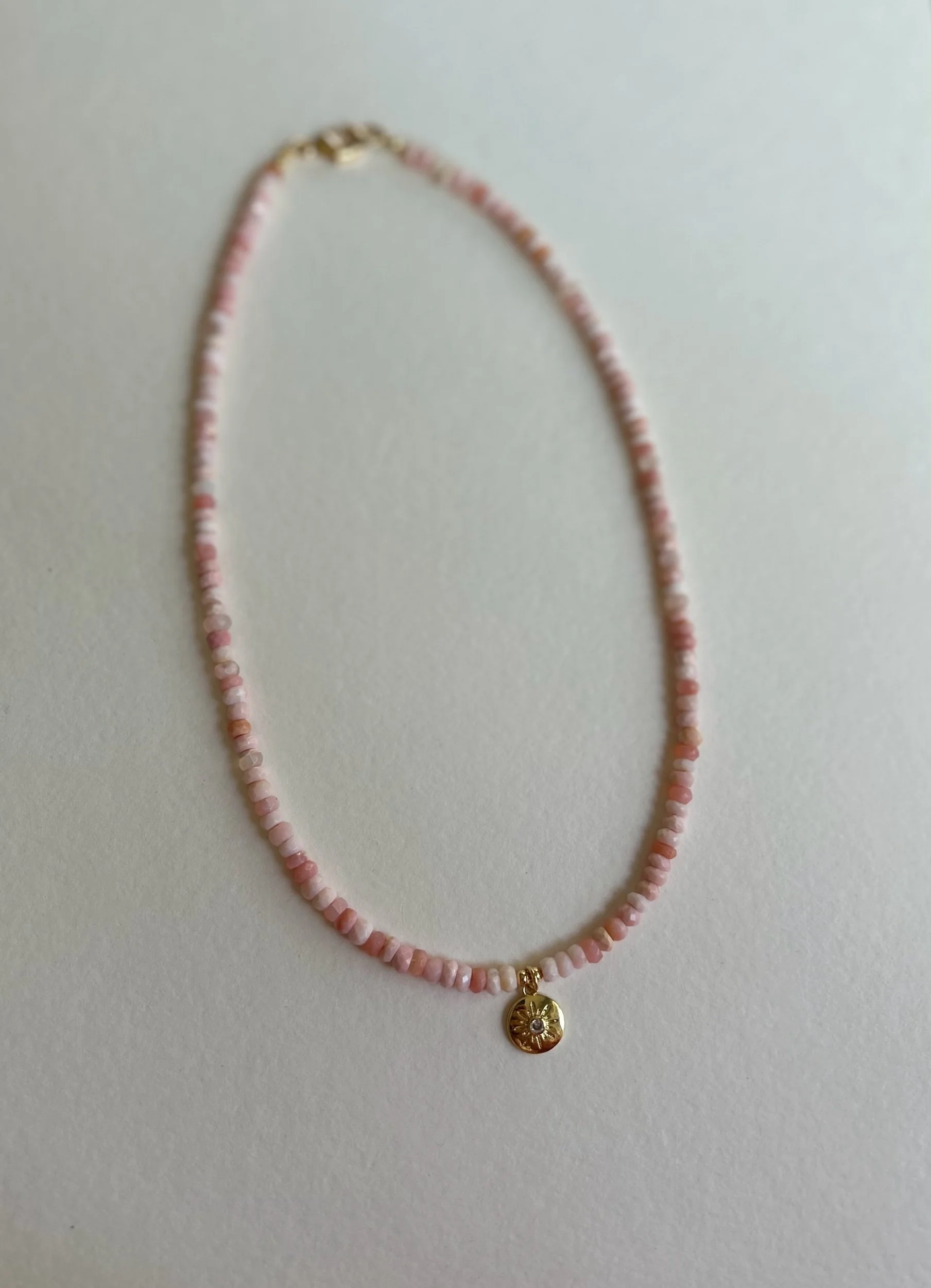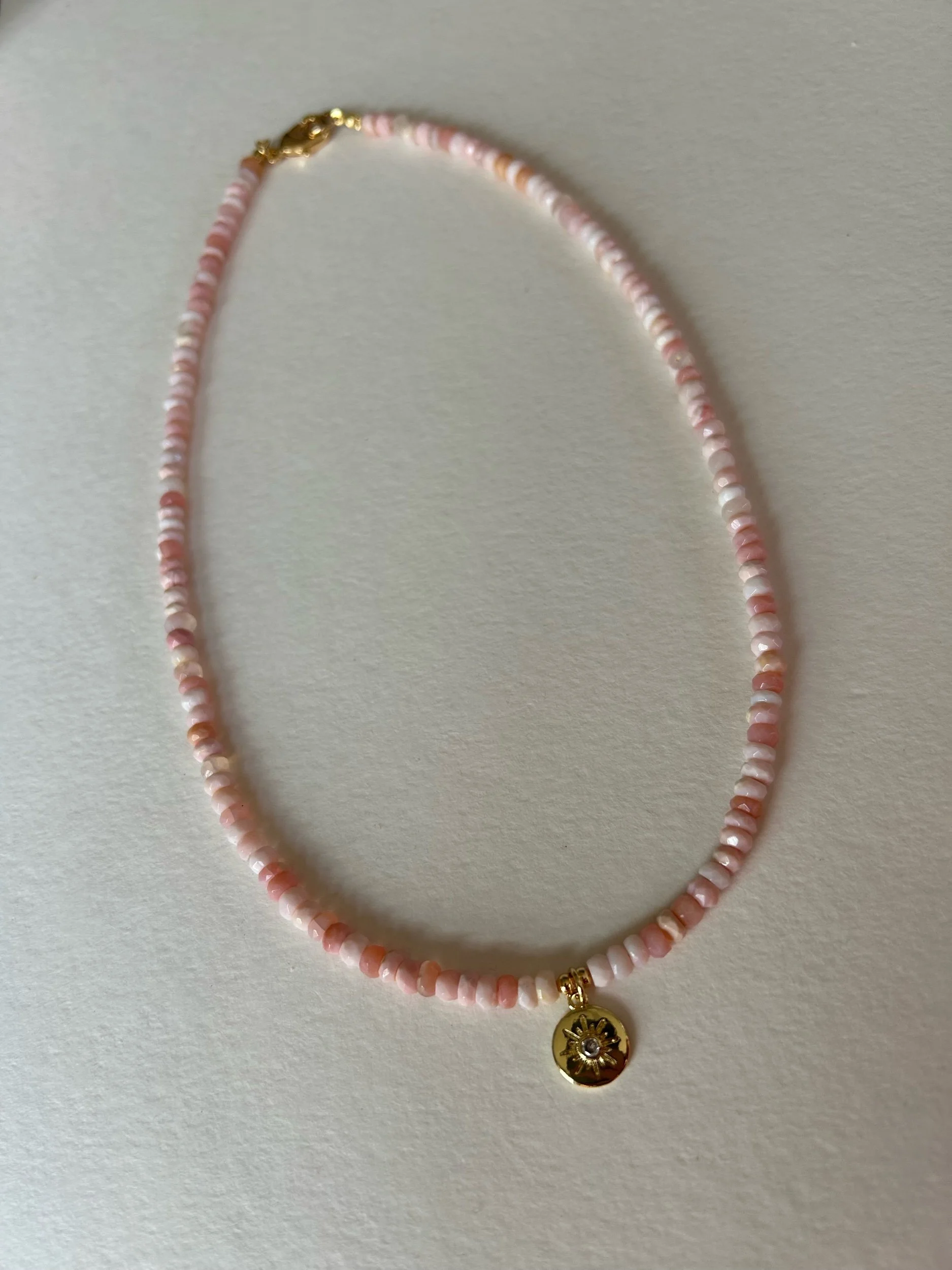This necklace is made with pink opal beads and has a gold filled coin sun charm. It has a lobster clasp closure and is approximately 16”.