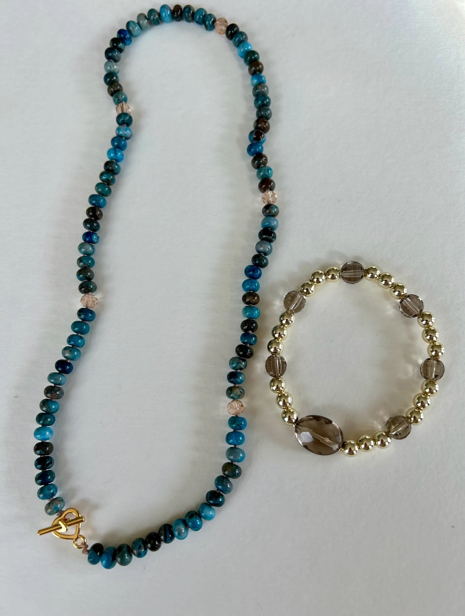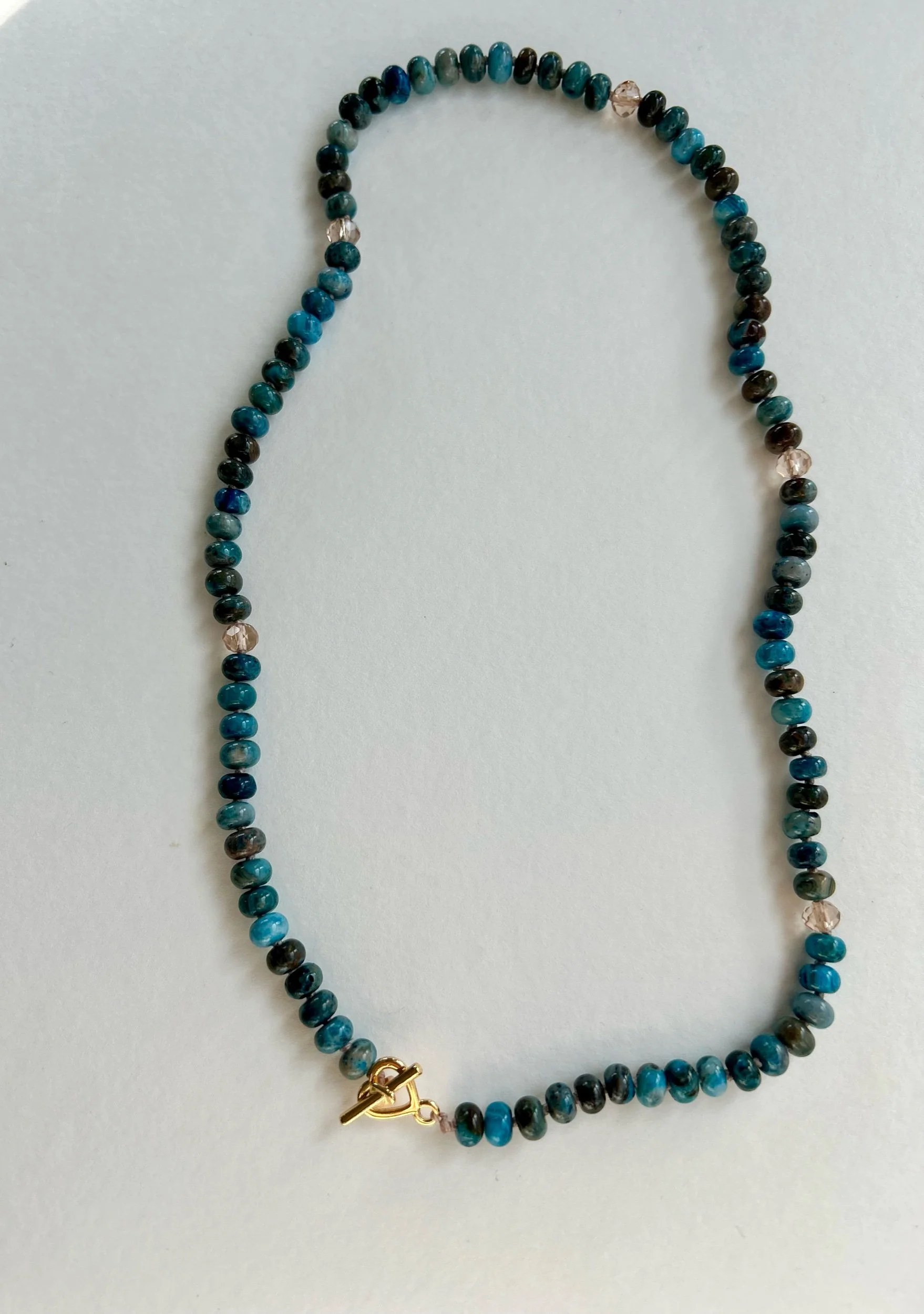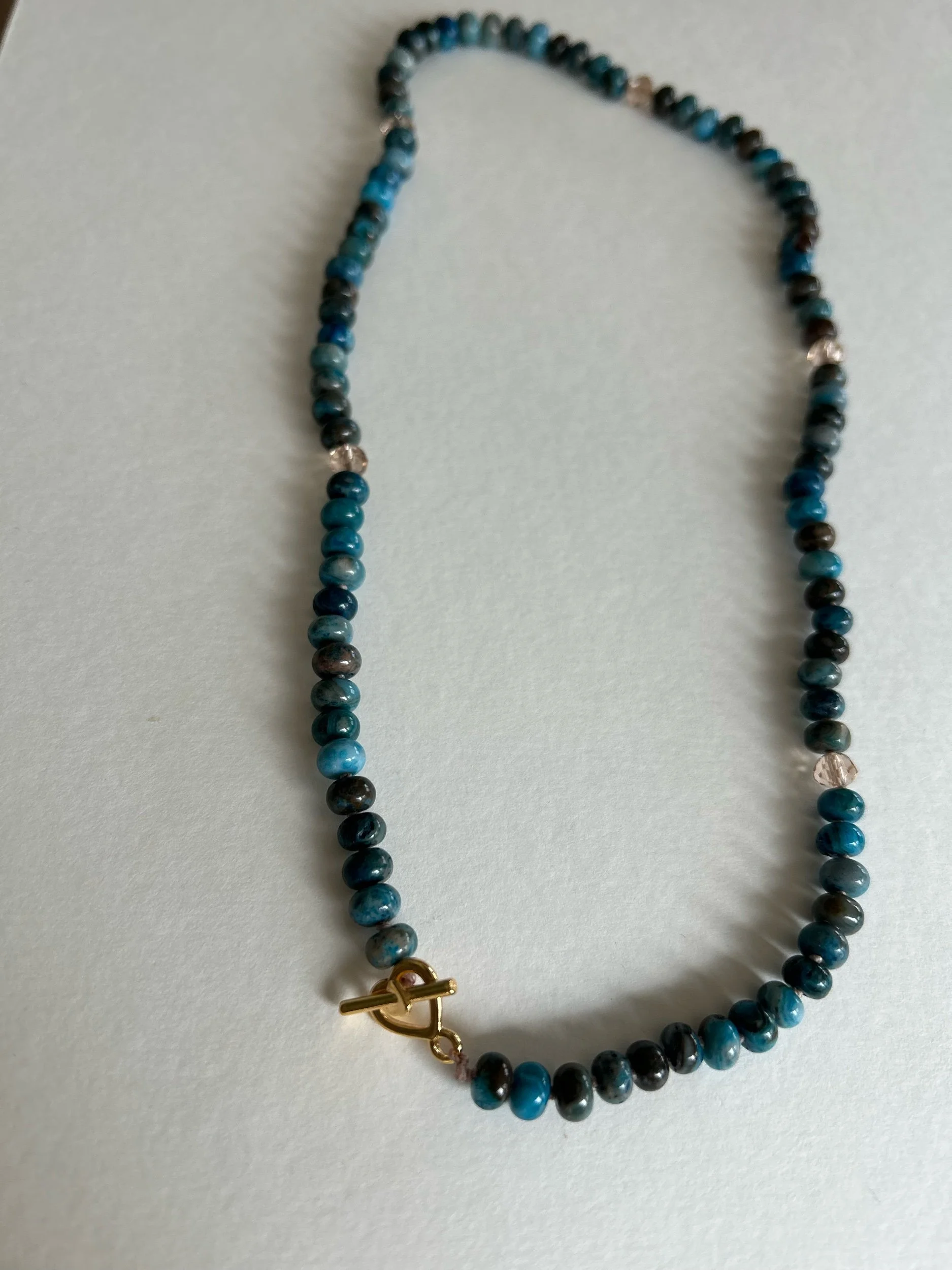 This necklace features 6mm blue lace agate rondelles with some sparkly champagne crystals mixed in. It has a heart toggle clasp that is so pretty you will want to wear it in the front! It is hand knotted with blush silk and is approximately 18.5”.