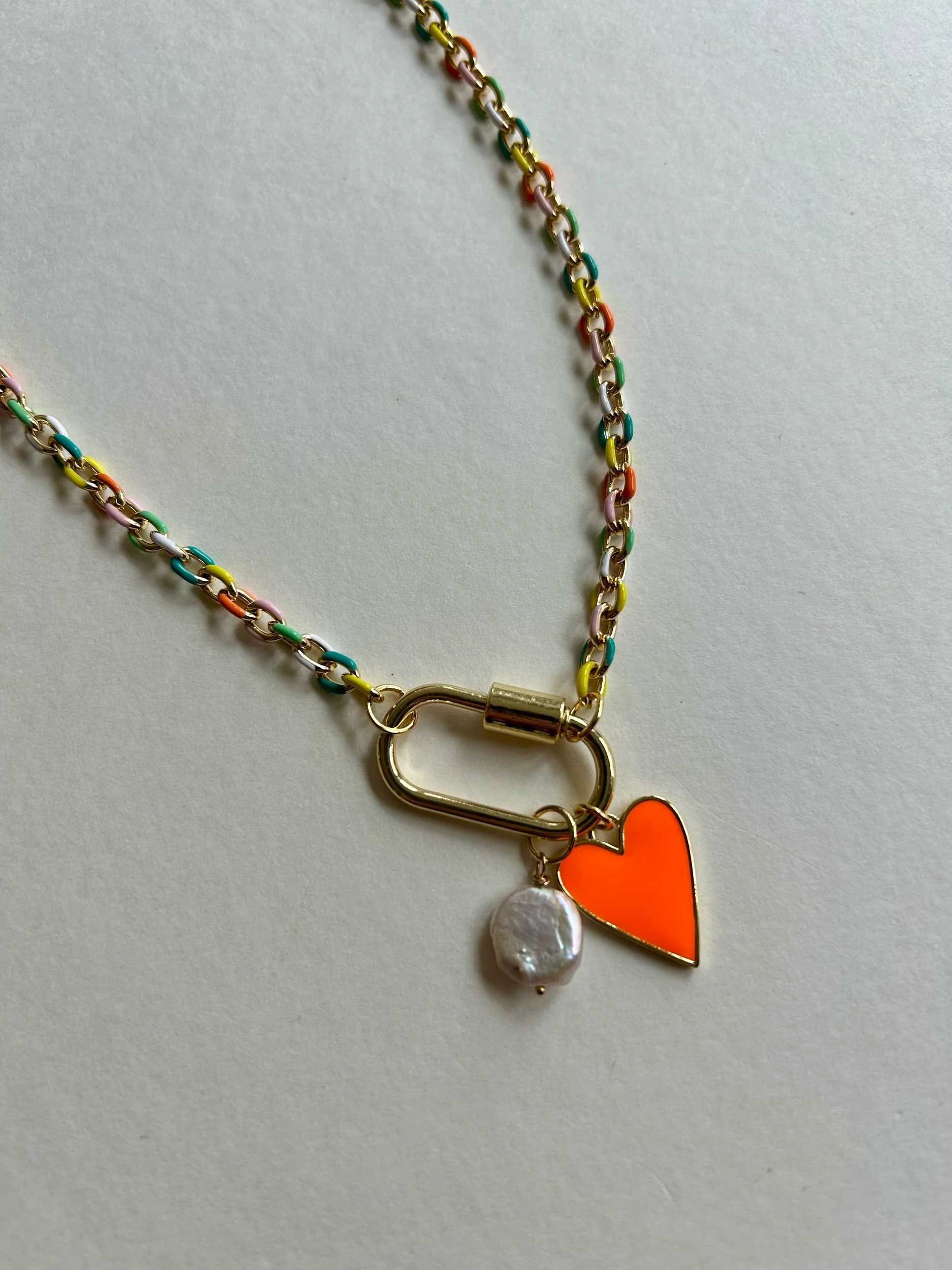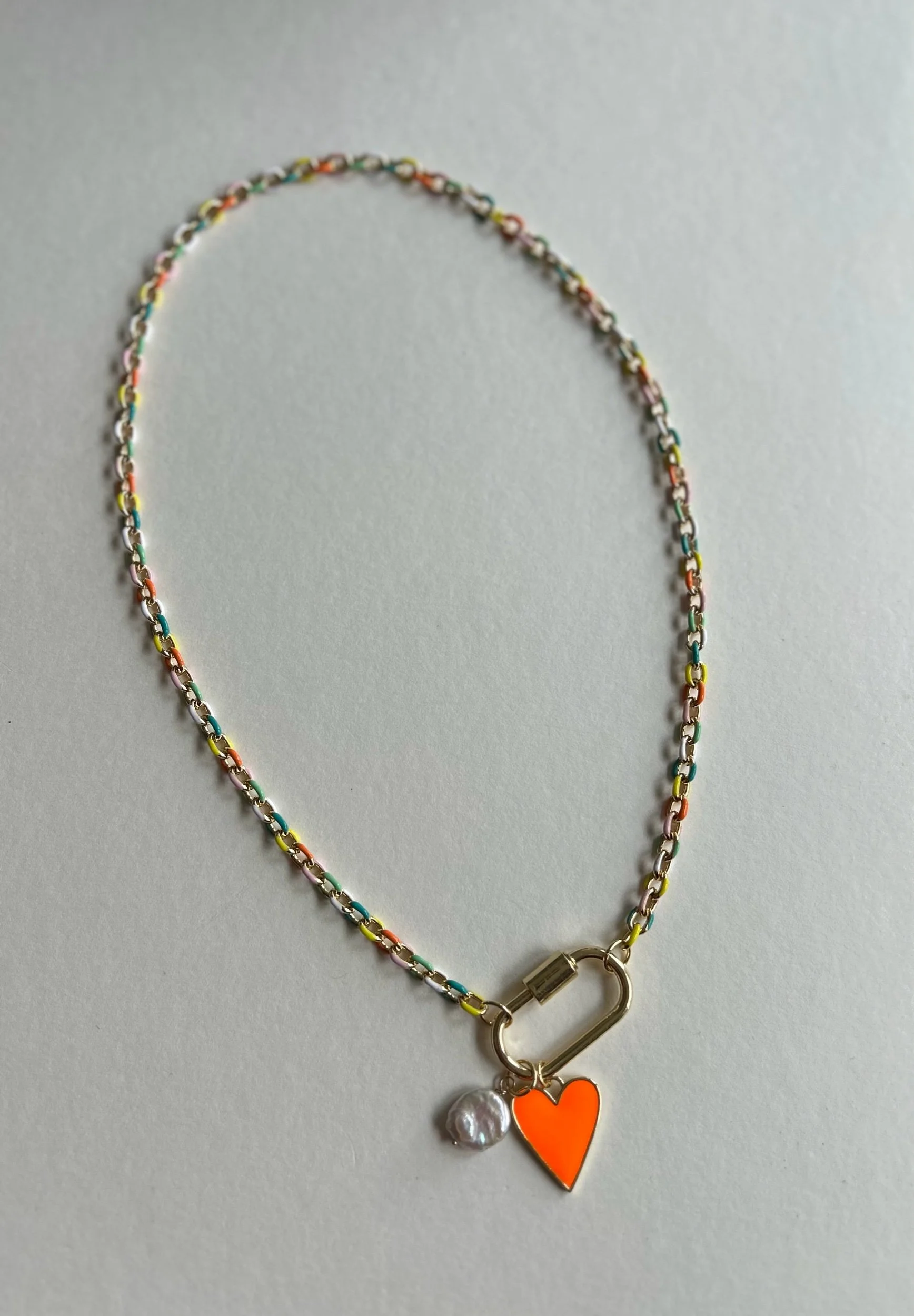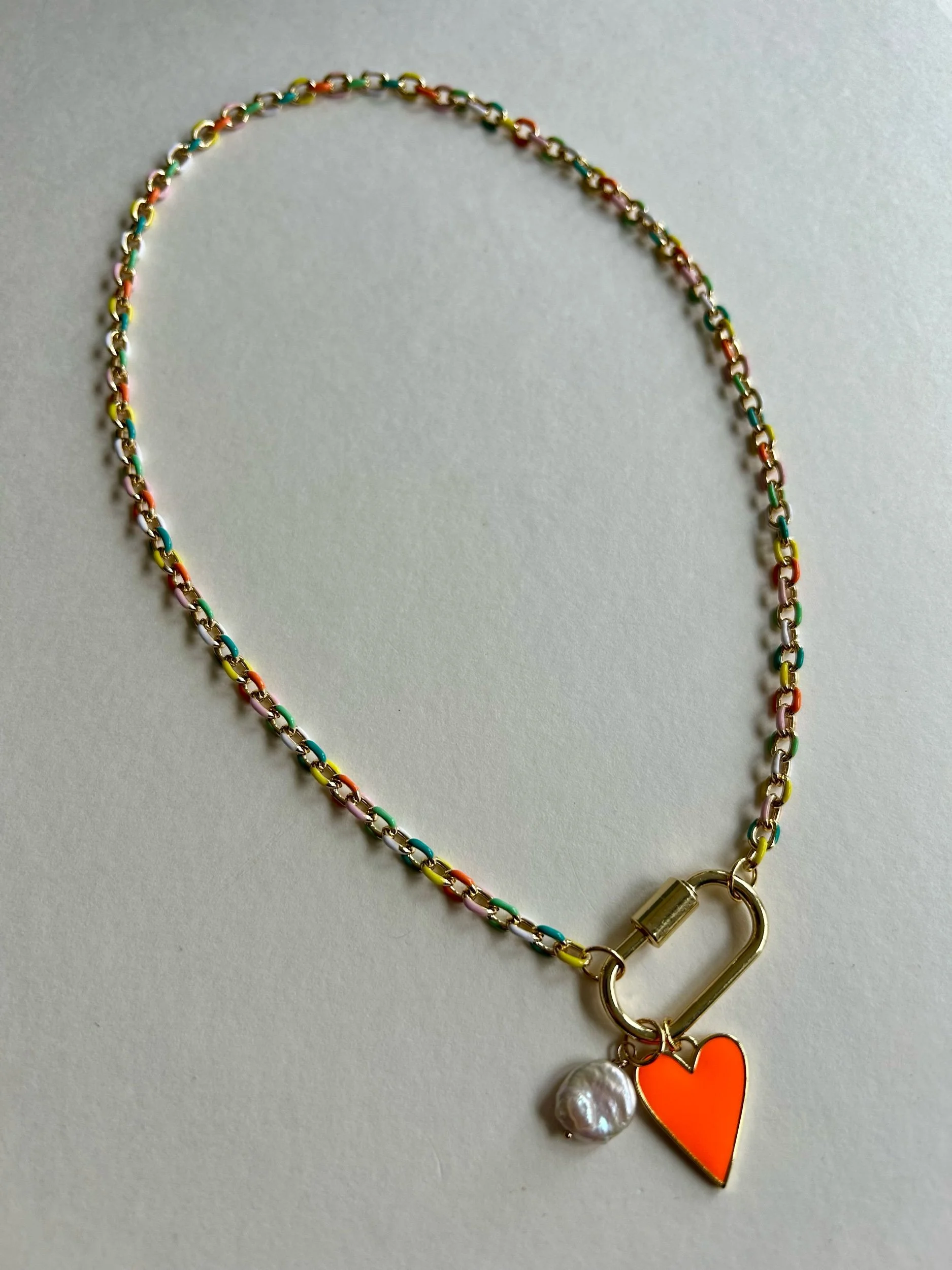 This colorful gold filled chain has enamel accents and a fun gold plated carabiner closure. It features a neon orange heart charm and a small freshwater coin pearl. The necklace is approximately 18.5”.