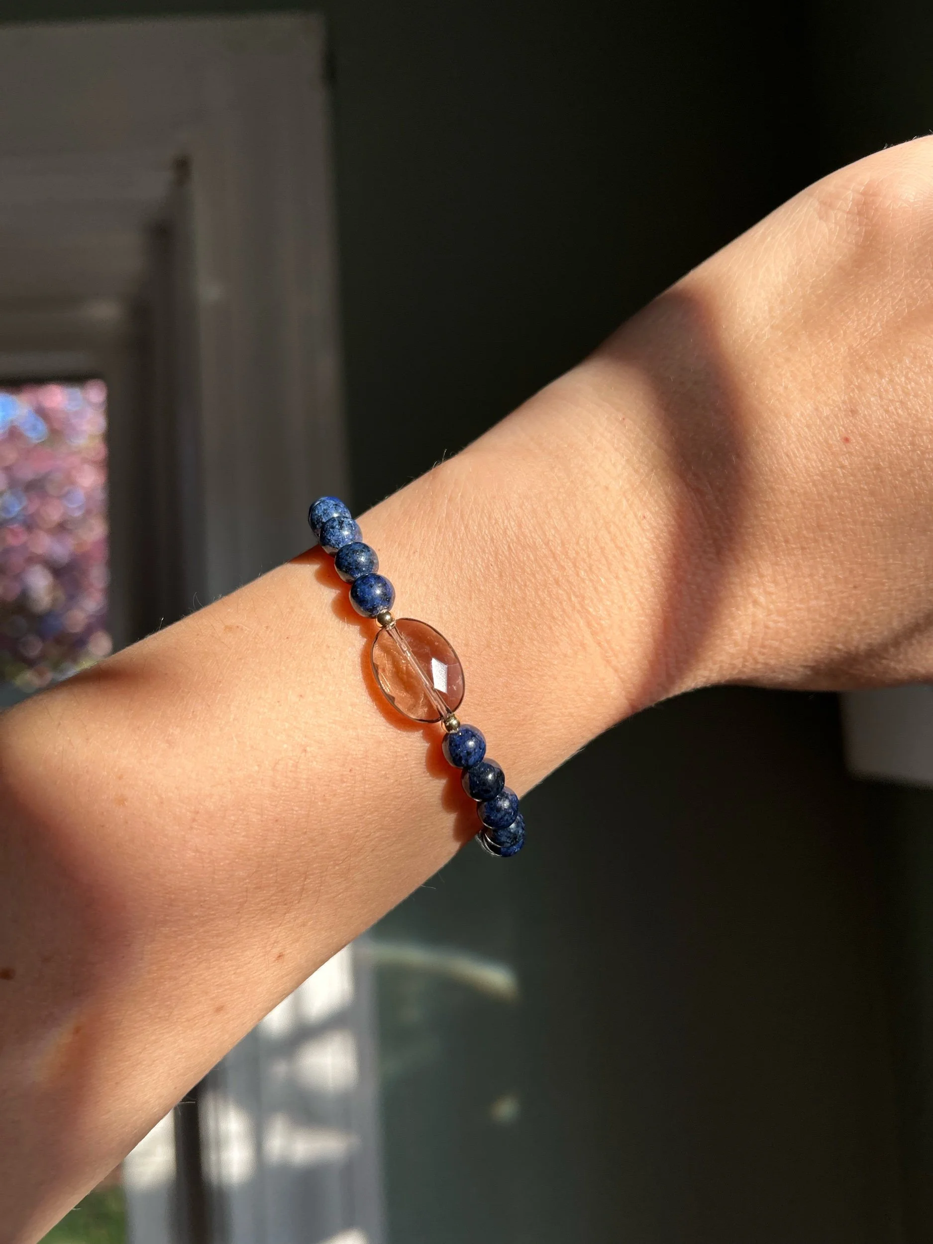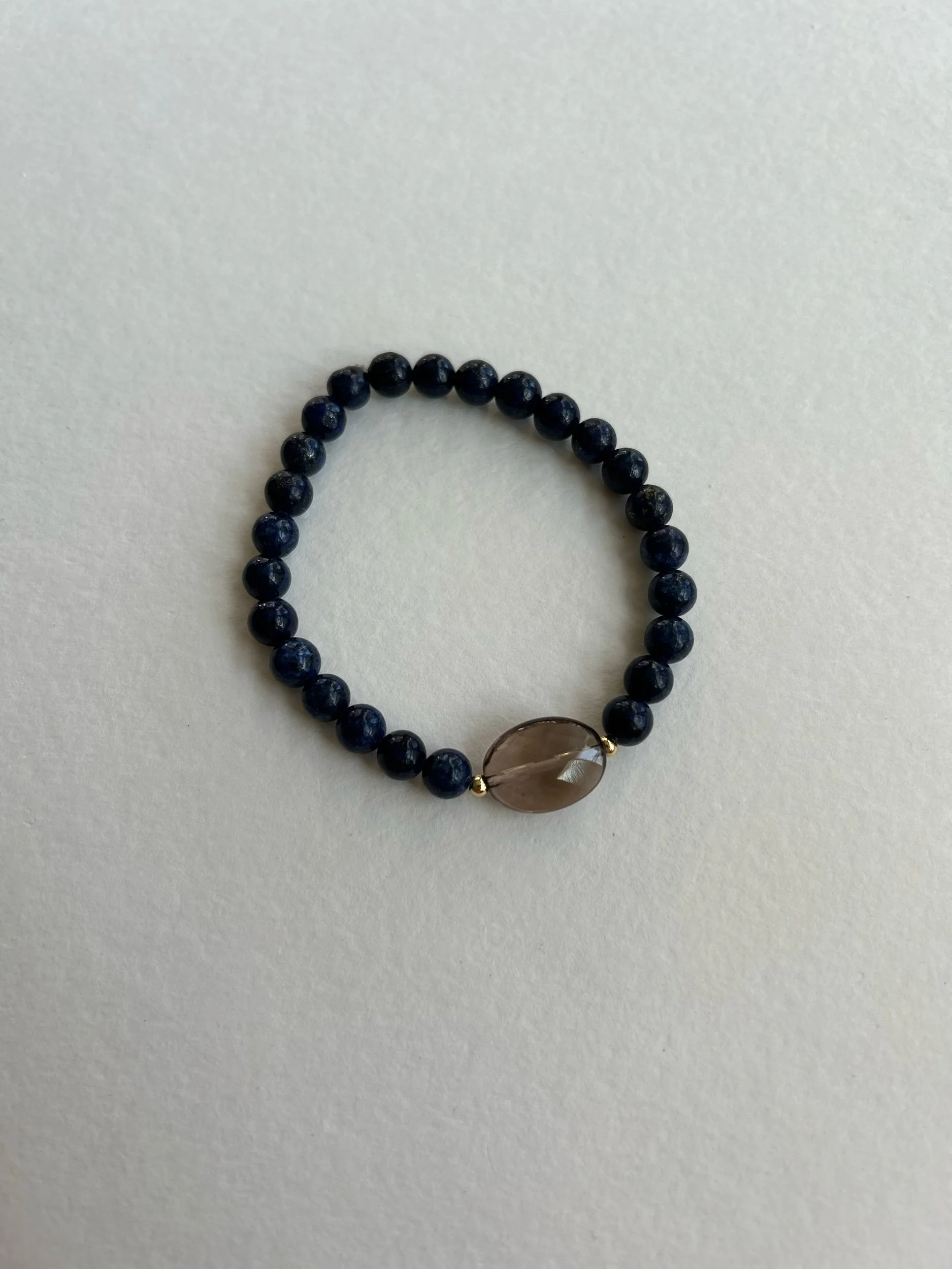 This beautiful mix of dark neutrals features 6mm lapis lazuli beads and has a faceted smoky quartz accent. It is approximately 7” and made on clear and durable stretch cord.