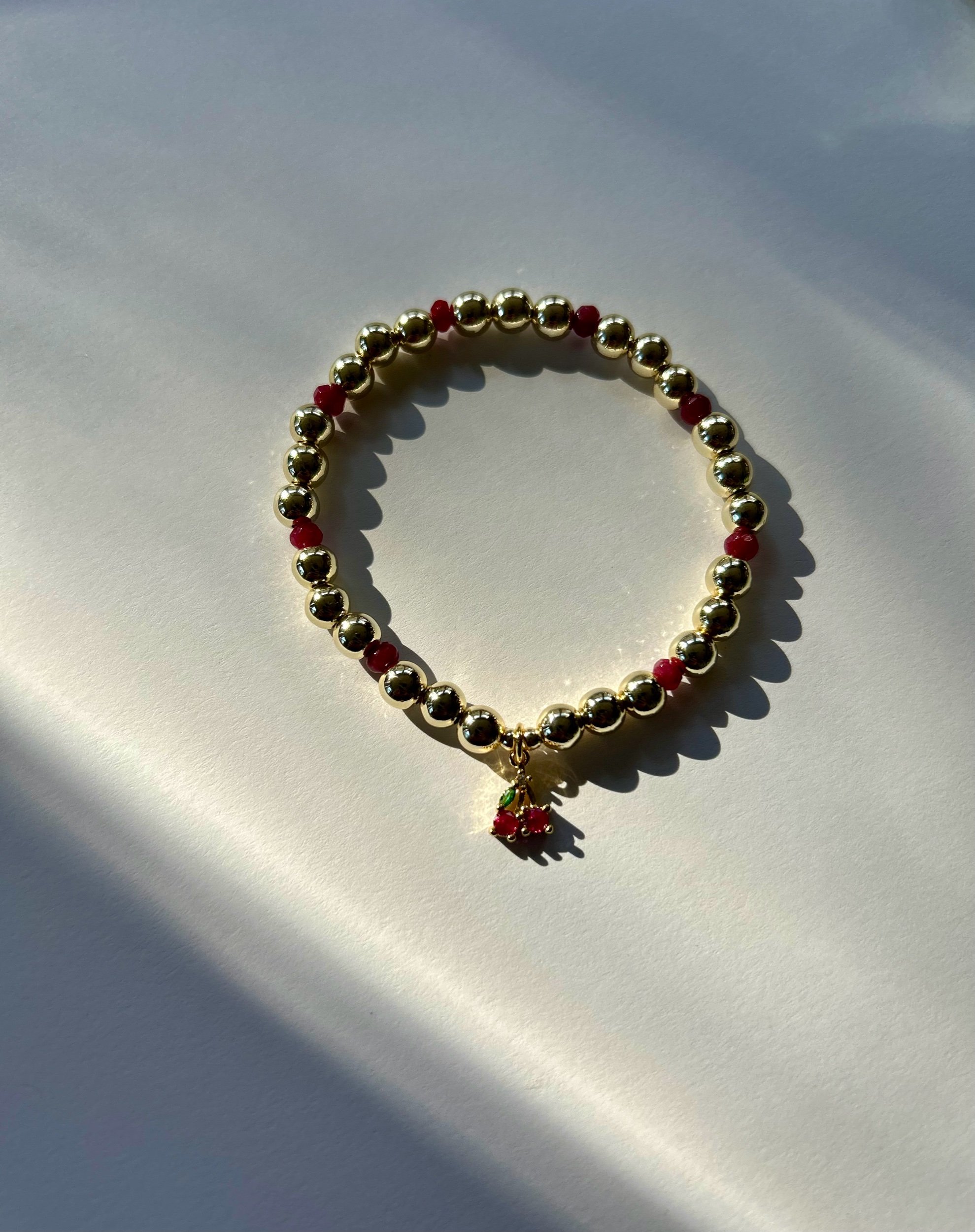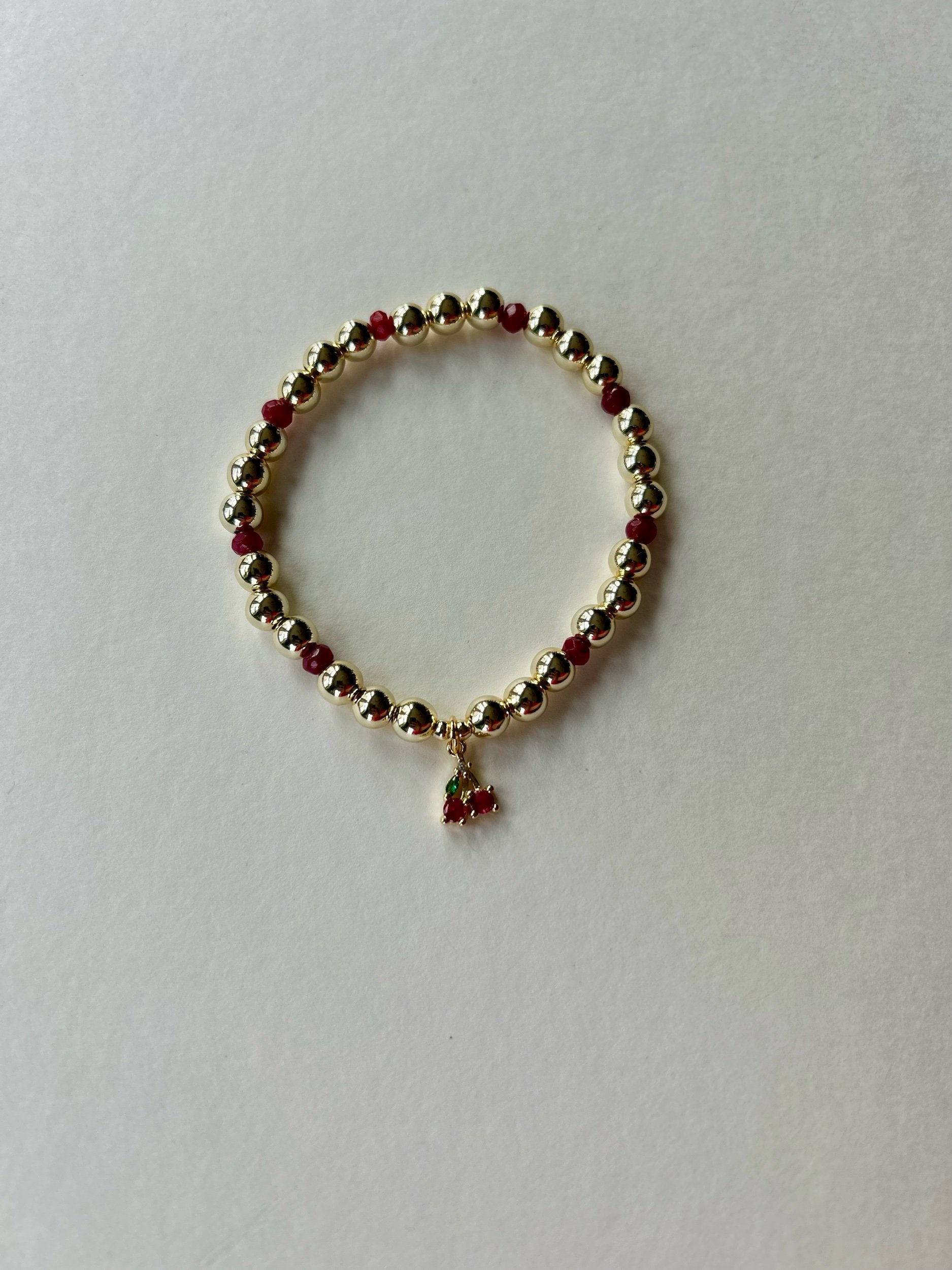 Need a little luck? Maybe this gold filled cherry bracelet will do the trick! It features 7mm gold filled balls, micro faceted agate accents, and a cherry charm. It is approximately 7” and made on clear and durable stretch cord.
