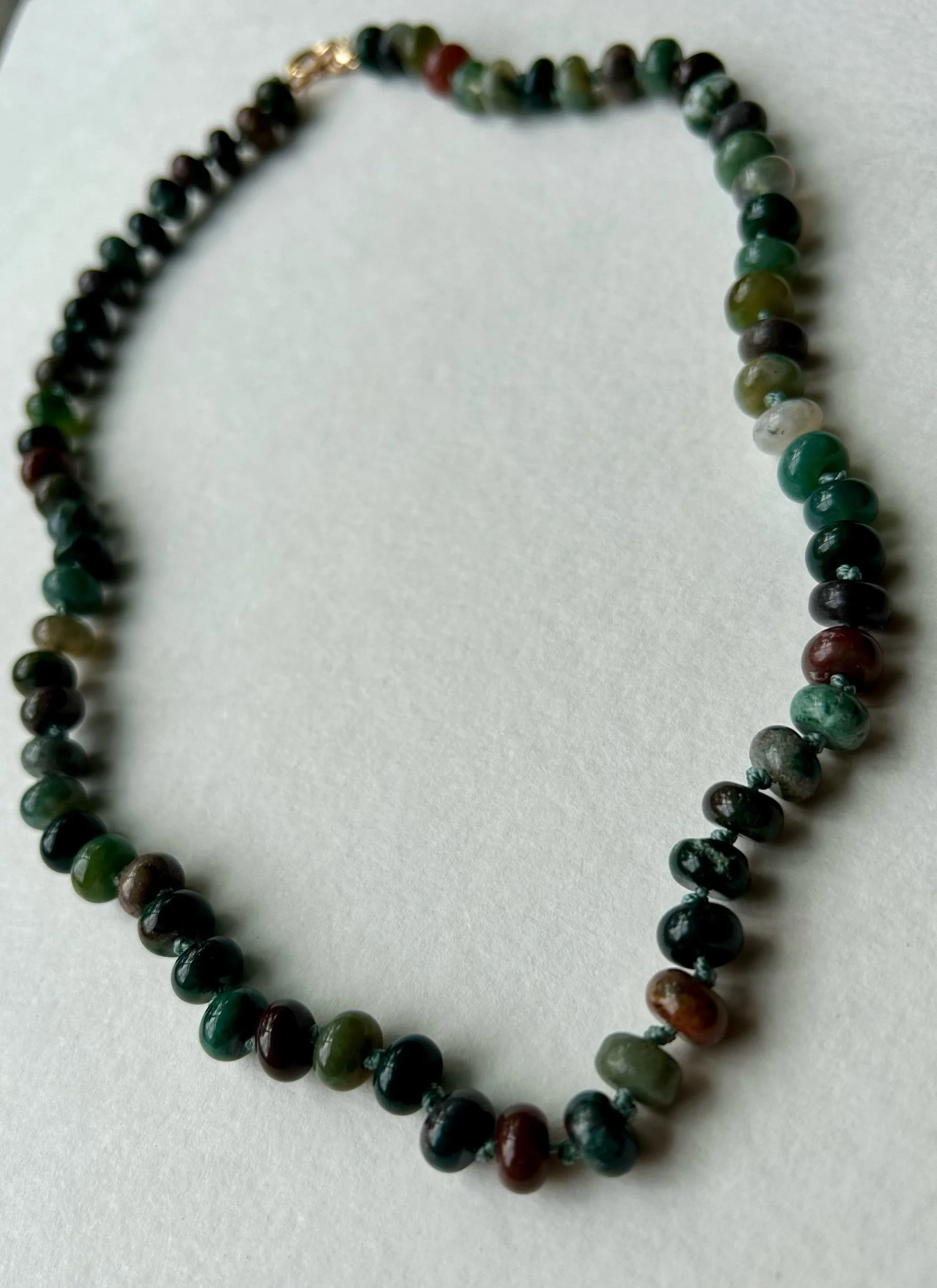 This hand knotted necklace features fancy jasper rondelle beads and sage colored cord. It is approximately 19” and has a lobster clasp closure.