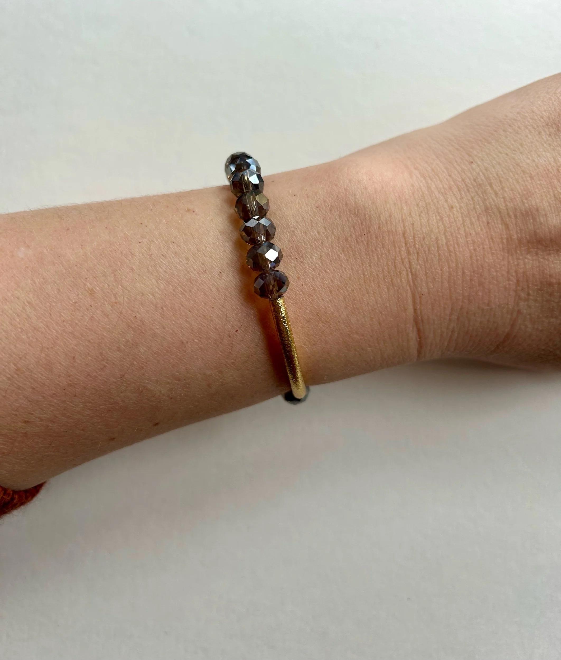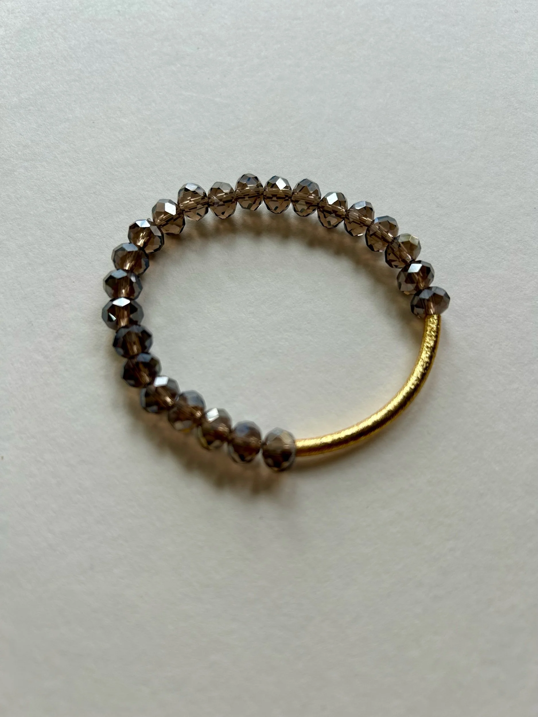 This unique bracelet has sparkly smokey crystal glass beads and a gold metal tube bead, making it part bangle and part beaded! It is made on clear and durable stretch cord and is approximately 7”.